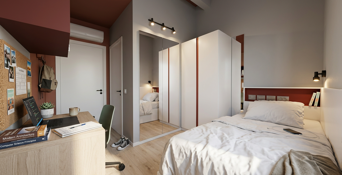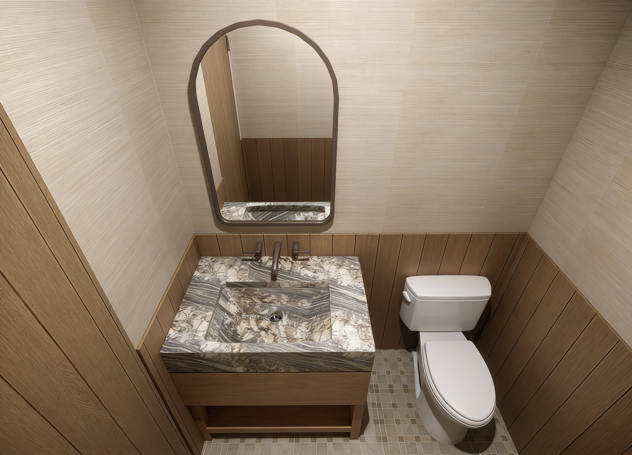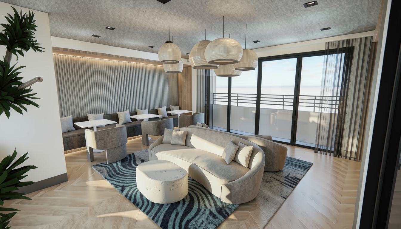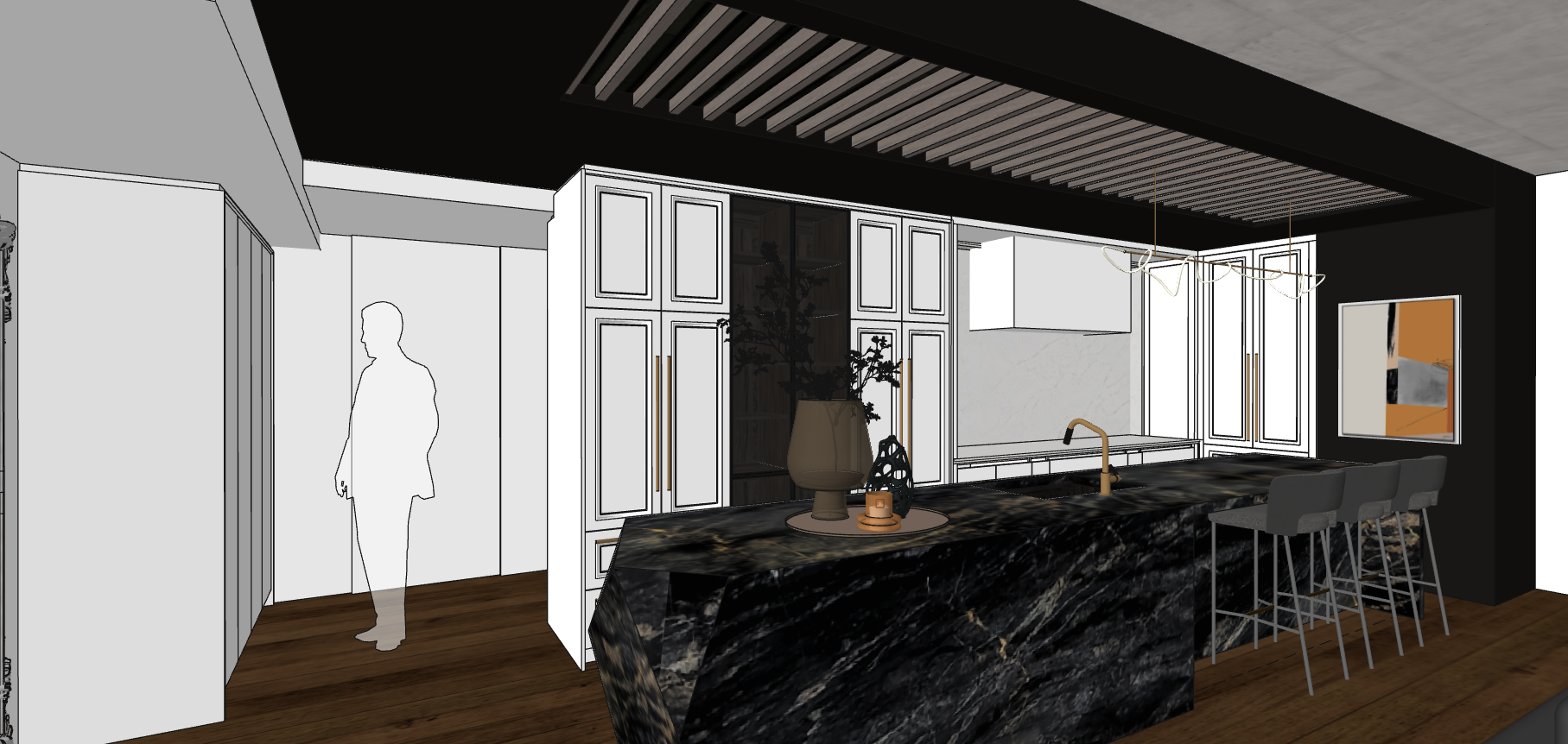 enhance this contemporary kitchen rendering while keeping all architectural volumes cabinetry layout proportions and materials exactly as shown do not modify the design millwork configuration island dimensions hood bulkhead ceiling details or overall composition maintain brutalist stone island keeping stone material scale and color as is matte finish stone should read black with golden veins white cabinetry some doors have heavy molding none of the white cabinetry include glass wall behind hood has stone material as is scale as is matte highest ceiling is poured concrete toned brass faucet and handles dark painted ceiling with almost black stain color wood plank insert in ceiling above the island medium brown wood flooring lighting upgrades only no design changes add warm vertical integrated led lighting 2700k 3000k inside the glass cabinets the interior of the glass cabinets should be dark almost black stained wood the shelves should be glass and should have some glassware introduce concealed under hood lighting that gently washes the stone backsplash enhance the sculptural pendant so it emits a soft warm diffused glow elegant not harsh introduce subtle ceiling spotlights that graze the stone slab and highlight material texture without flattening it mood atmosphere create a chic warm sophisticated ambiance the space should feel intimate refined and quietly luxurious lighting should emphasize contrast between the deep cabinetry and the luminous marble island the dark wood should read rich and layered not flat black the brass should feel brushed and softly reflective never shiny or brassy the marble should glow gently under warm light revealing its veining overall feeling a high end editorial interior photograph soft and natural moody yet welcoming dramatic but balanced refined warm inspiring avoid changing materials changing finishes changing proportions overexposing highlights cool lighting temperatures adding new decorative elements render as a photorealistic cinematic interior shot with depth soft shadows and natural light falloff