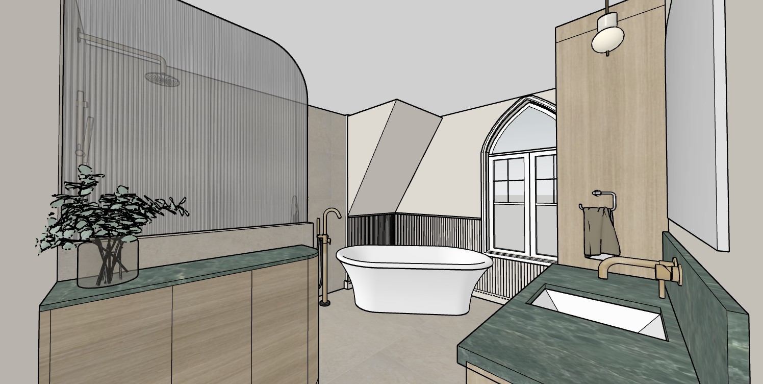 only improve lighting realism natural light soft shadows and reflections add subtle ambient light and realistic daylight direction if needed add a simple and neutral outdoor background through windows natural sky soft greenery no strong colors the goal is to enhance realism while preserving 100 of the original design strict preservation of original materials and color tones no redesign no color shift do not add any windows or door the glass is flutted ant the wall behind the bath is flutted like te color of the wall