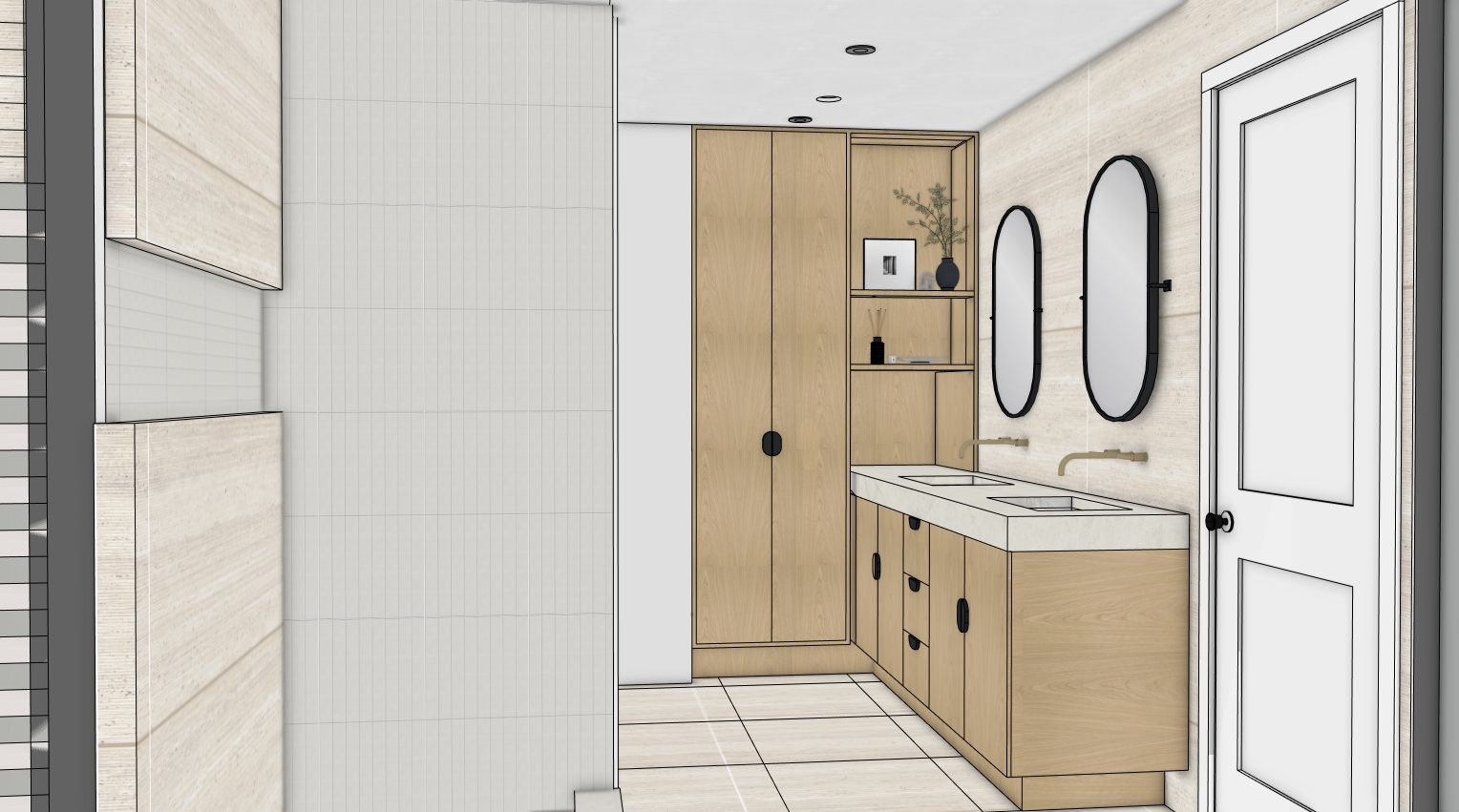 preserve the original geometry and colors and textures textured tile on the back wall white tile in the shower white oak slim shaker cabinetry marble countertop add in 2 light bars above the 2 mirrors with frosted glass and bronze middle