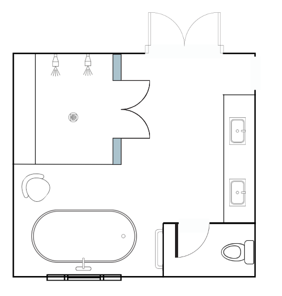preserve the exact layout camera angle and placement of all elements do not move or redesign anything enhance the bathroom with realistic finishes light wood flooring full height tiled shower tub walls to the ceiling warm wooden vanities light colored quartz countertops subtle greige colored walls brushed nickel plumbing fixtures add soft warm lighting