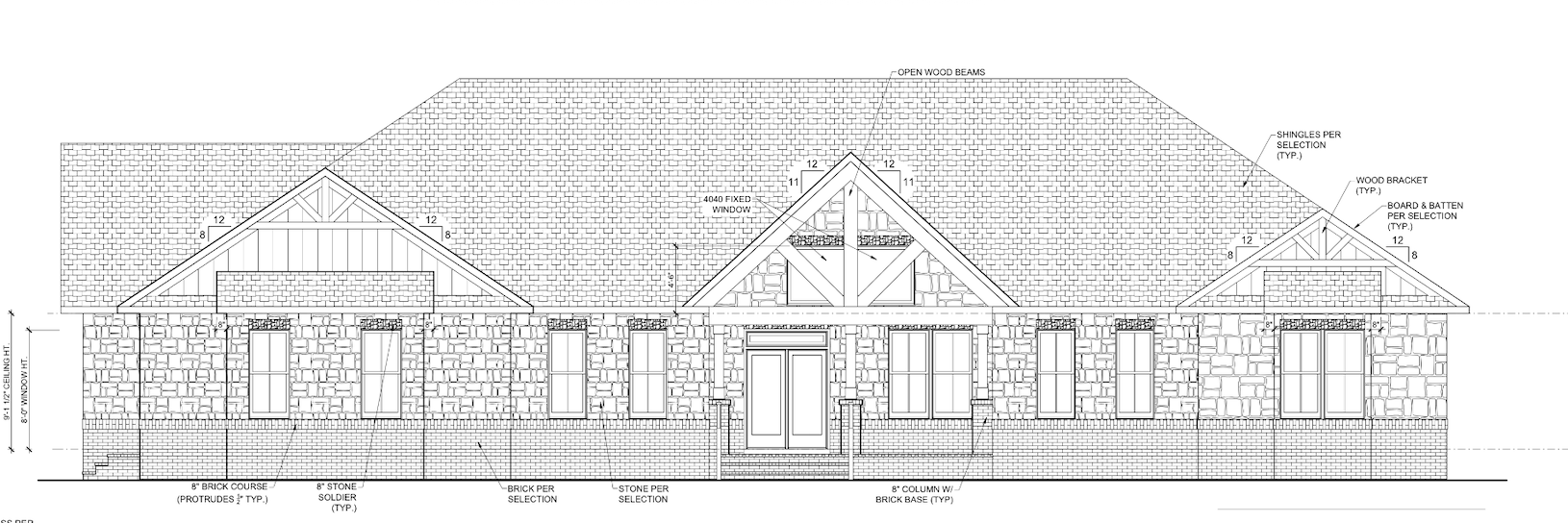 apply materials only to the correct regions primary wall cladding monotone limestone apply the provided creamy off white limestone swatch with matching light mortar to all main wall fields shown as stone on this elevation the large irregular block pattern across the fa ade keep it monotone with gentle natural variation no high contrast mortar no yellow orange cast brick base water table the lower band shown as brick the running brick course across the bottom should be warm light greige taupe brick subtle understated low contrast so stone remains primary any brick column bases noted brick base typ should match this same brick gable infill cladding board batten in the gable triangles where the drawing indicates vertical boards apply smooth board batten in the same warm off white tone as the hardie trim selection matte finish very subtle vertical shadow lines trim fascia soffits columns all trim elements fascia soffits corner boards window door trim columns in the warm off white greige shown on the selections board hardieplank trim color keep trim clean and crisp no texture bleeding from stone roof shingles apply dark charcoal graphite shingles per selections matte fine texture consistent across all roof planes no exaggerated patterning exposed gable truss wood beams for the open wood beams truss elements in the center gable and any wood brackets apply the rich stained wood tone from the wood swatch medium dark brown satin matte keep grain subtle and scaled appropriately windows front door window frames matte black window color front door black to match concept glass neutral minimal reflection do not add dramatic reflections gutters downspouts apply the gutter color from the concept board warm taupe bronze leaning neutral subtle satin