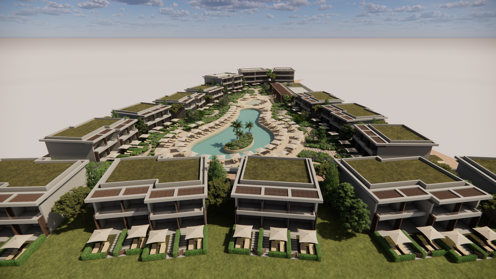 place the render at the green area of the reference image like a background careful at the scale do 3d also the buildings of the reference image via a draft version