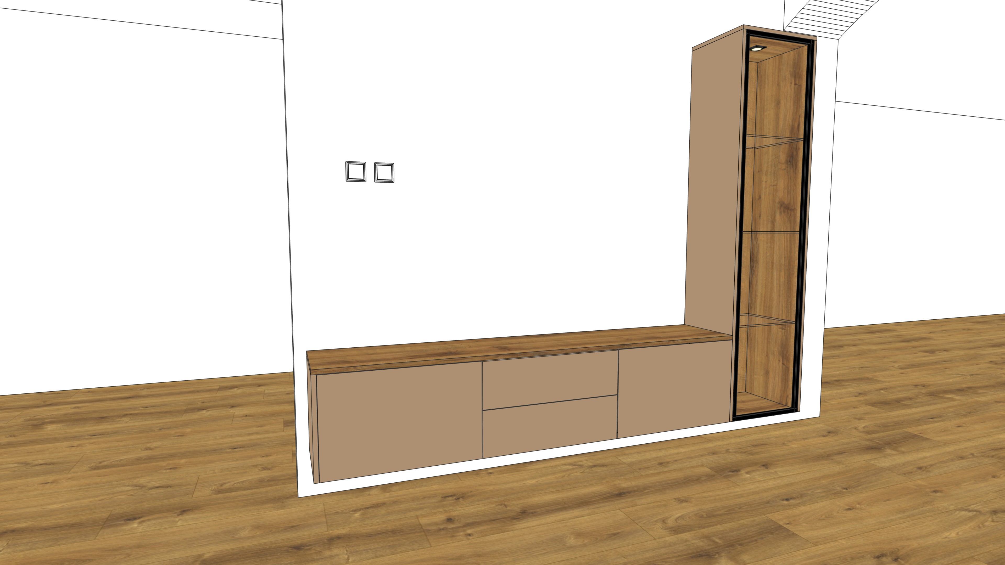modern minimalist living room wall unit exact same geometry and proportions preserve original design materials all exterior cabinet surfaces including sides fronts and the outer frame of the tall cabinet in egger u250 light beige uniform color no wood texture only the interior of the display cabinet in egger h1344 natural oak warm medium tone wood visible wood grain strict material separation no wood on exterior surfaces wood only inside the cabinet tall display cabinet with black aluminum frame and clear glass door warm vertical led lighting inside cabinet 3000k soft led underglow under base cabinets warm white clean white walls natural daylight soft shadows oak floor preserved photorealistic rendering high detail materials realistic lighting no redesign preserve exact layout no color shift no green tint no grey tint no wood texture on outer cabinet surfaces no decorations