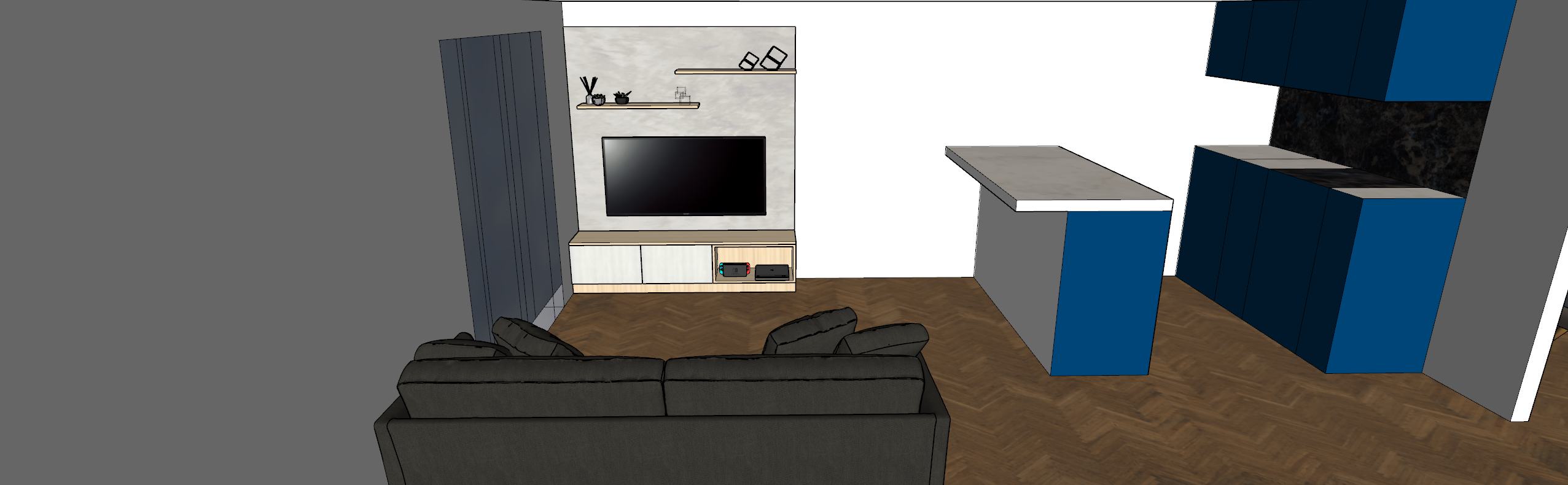 aeral view of a inside living layout make realsitic navy blue kitchen and a wite counter top