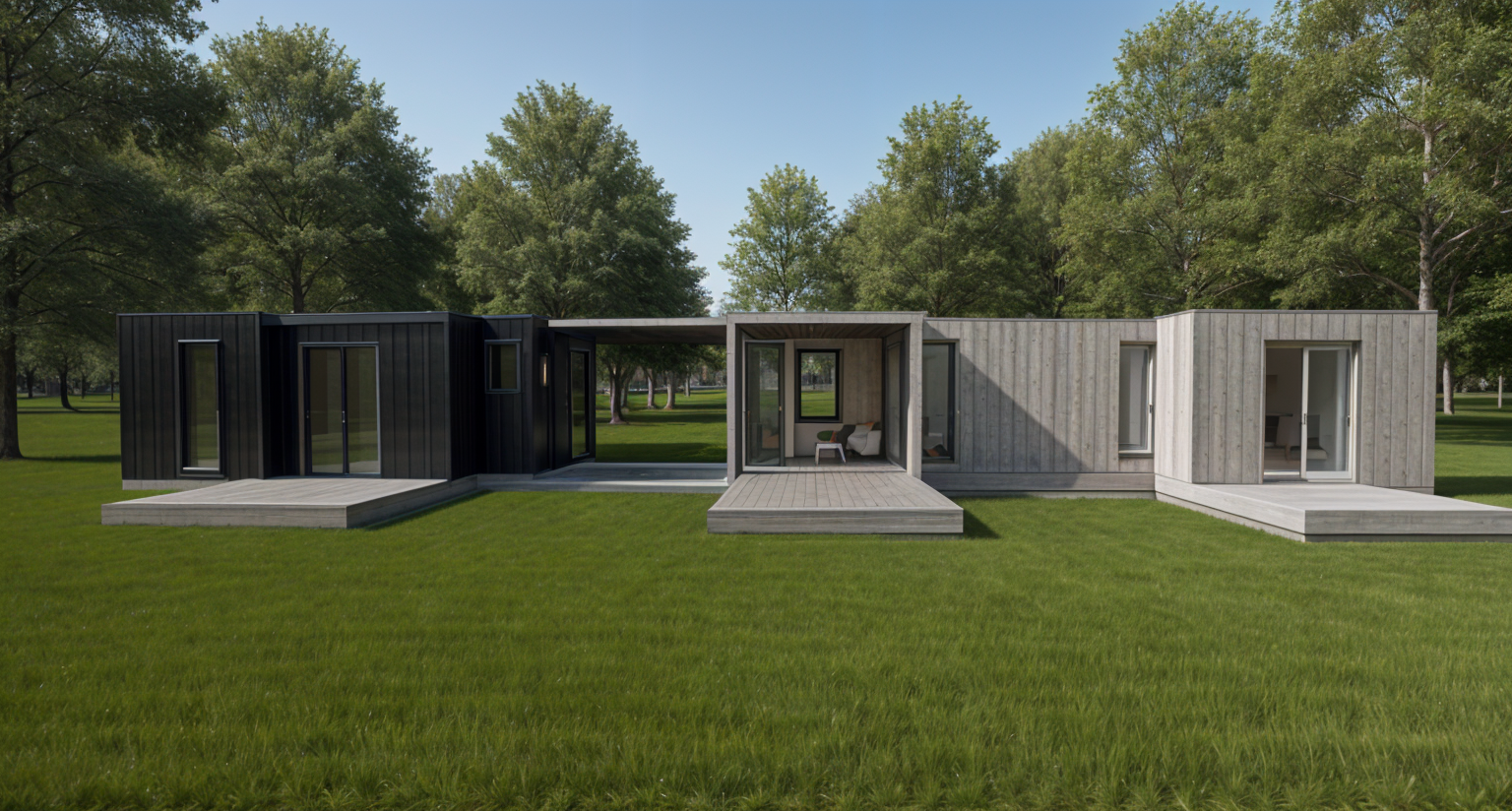 modernist exterior shot it is a modular house with three parts connected with porches between each module facade is vertical striped prefabricated panels cladding 5cm aluminum black color material is quadroline by hunter douglas in the left module and in the right module vertical 1m width fiber cement prefabricated boards cement color viroc cement board panels this houses are mostly used in outdoors like woods please use a backround accordingly sunny day and a beautiful green grass all over the place and in front of the left module and in the floor a deck without furniture in the deck show a living room in the inside not use what original model has inside use blured window in the narrow window there is only one narrow windowthe floor ouside the homes is onluy green grass architecture architecture