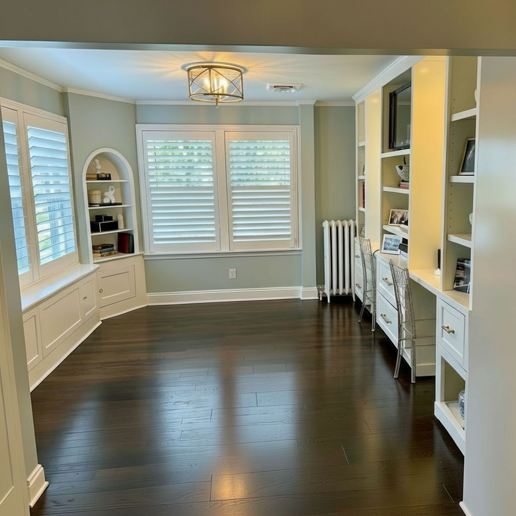 enhance the rendering to feel more photorealistic improve the lawn with lush natural green grass featuring realistic variation in tone subtle imperfections and soft edge transitions along the driveway and foundation add medium height mature trees in the backyard positioned farther behind the home ensure trees are scaled realistically to the two story house no taller than 1 25x the roof peak height place trees at a natural distance to maintain proper perspective depth trees should appear slightly softened by distance and atmospheric perspective with the home remaining the primary focal point change the color of the bump out surrounding the center double garage door to charcoal gray to match the existing garage door color exactly maintain material texture and lighting realism preserve all other home colors materials architectural details and the existing evening lighting ambiance