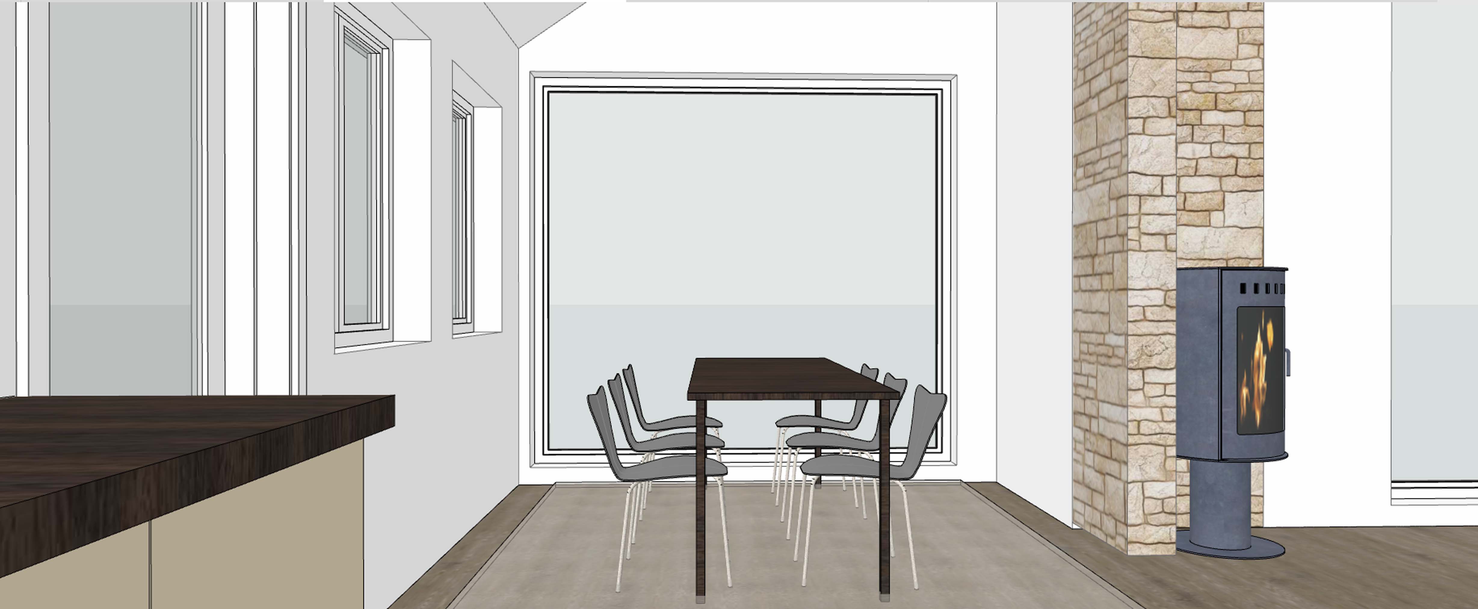 render a cosy modern diningroom you can sea the sea from the windows the cabin lies on a small mountain with a spectacular view at the sea in norway over the diningtable its a big maritim chandelier