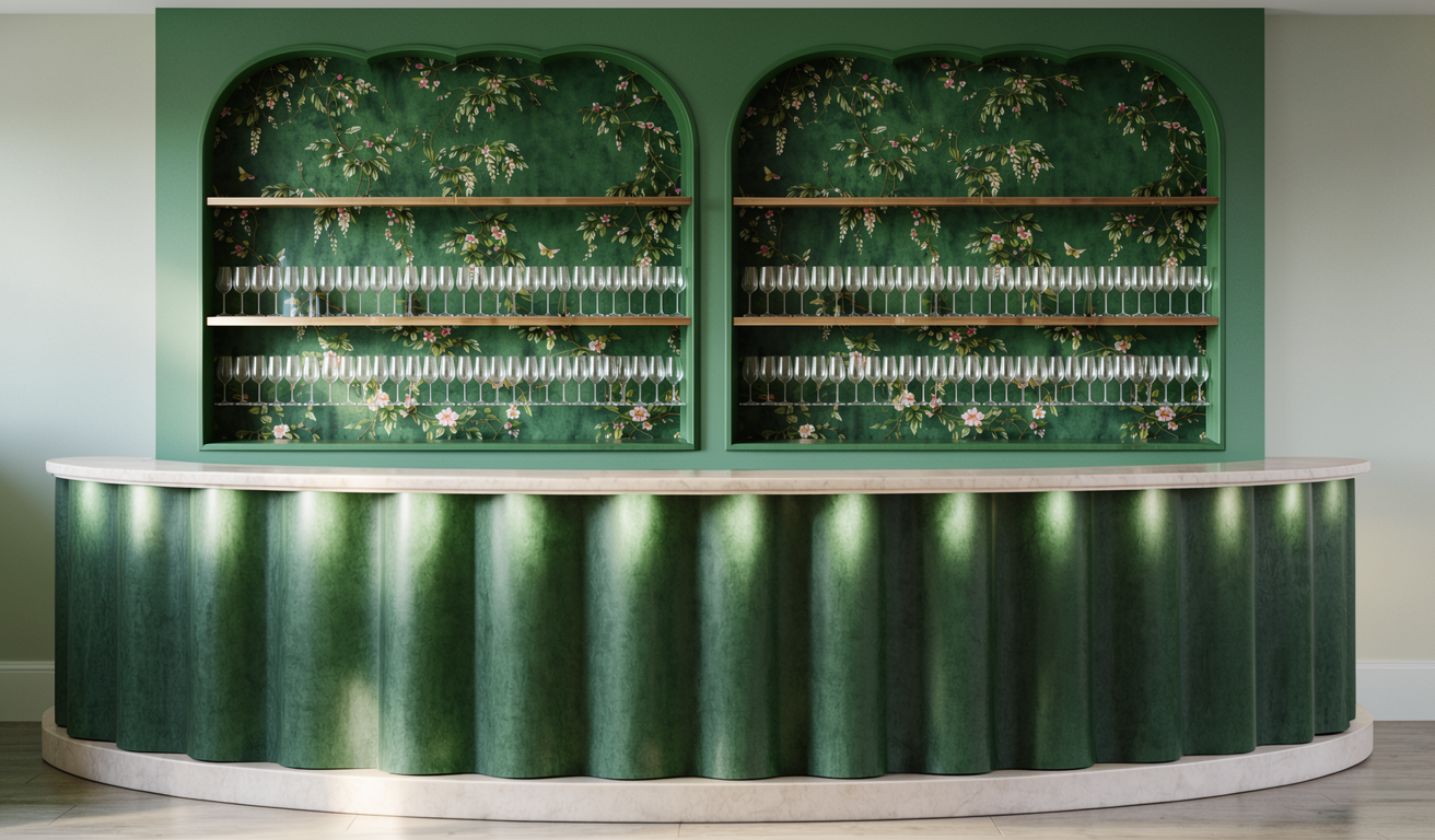 walls white trims around doors and windows black forest and lake in background