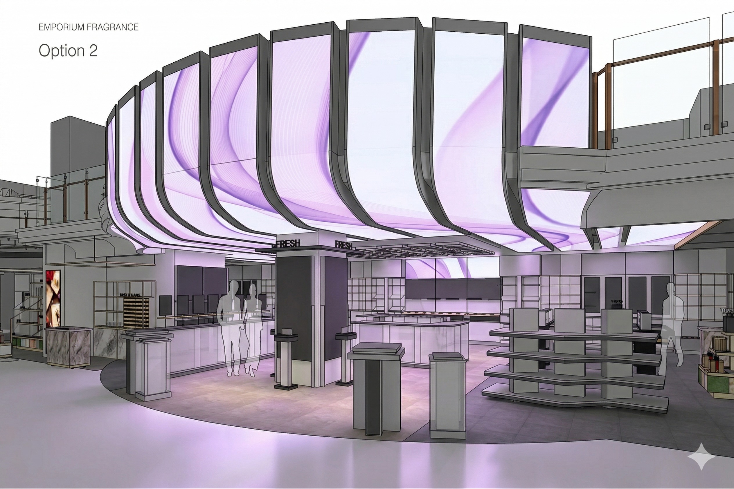 studio lighting soft shadows illuminate the main ceiling wave feature