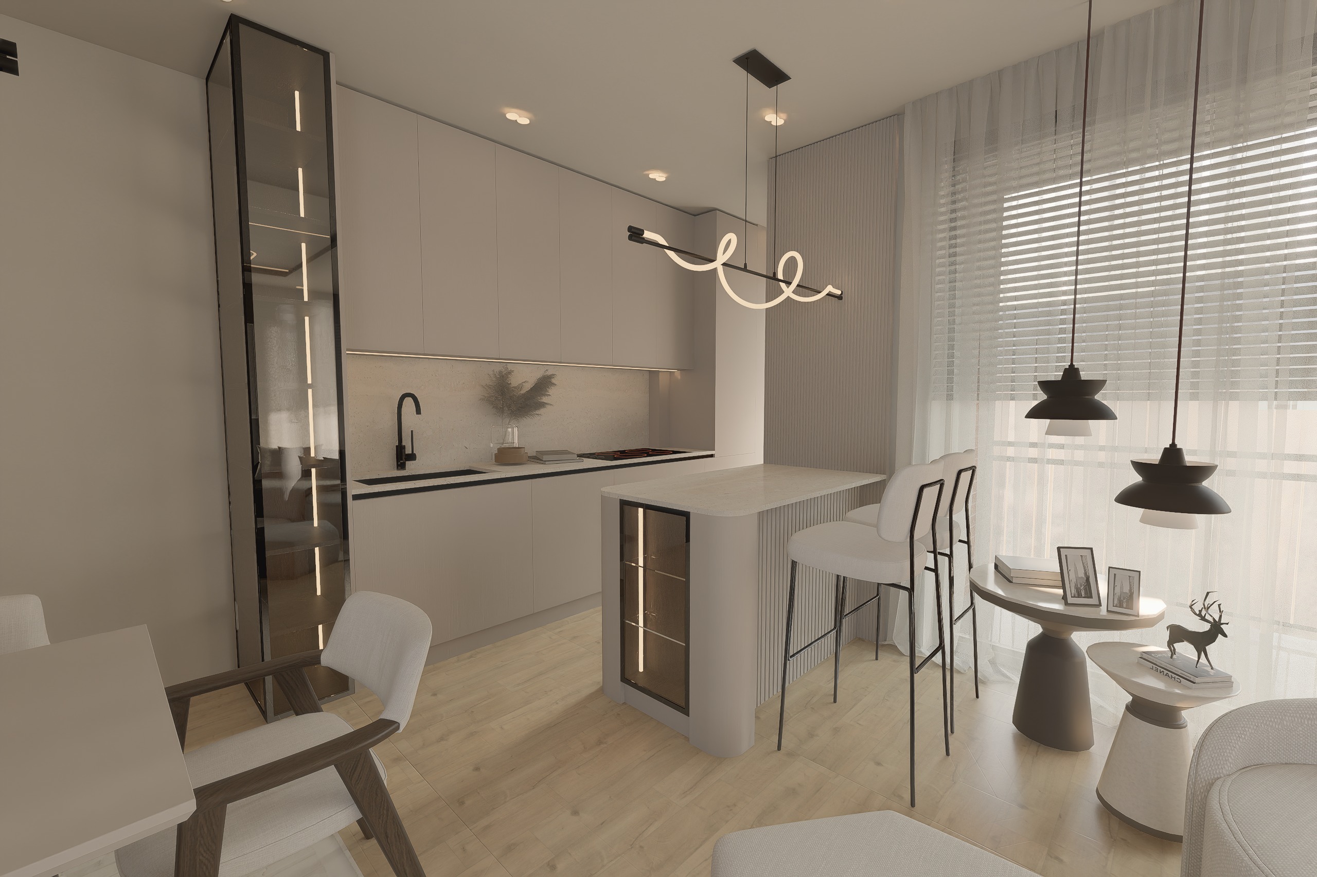 ultra realistic render of a modern minimalist kitchen corner with island strict keep exact geometry layout camera angle and all object proportions do not redesign anything materials finishes kitchen cabinetry matte beige soft cream lacquer handleless ultra smooth finish countertop backsplash light warm quartz stone very subtle grain clean and refined island same stone top fluted vertical base panels in matching tone built in wine cooler dark glass with warm internal led lighting tall glass cabinet smoked glass with vertical integrated led strips warm 3000k floor light natural oak wood matte finish visible grain bar stools light fabric upholstery with slim black metal legs side tables matte neutral tones with soft curves curtains sheer white fabric soft light diffusion lighting main sculptural pendant above island keep exact shape warm 3000k secondary decorative pendants on right side keep shapes soft warm glow ceiling spotlights subtle and realistic no overexposure strong daylight entering from right side windows through sheer curtains balanced interior exterior exposure no blown highlights details keep accessories minimal books small decor objects dried plant maintain black faucet and cooktop details exactly realistic reflections on glass wine cooler tall cabinet subtle imperfections for realism very slight texture variation rendering style photorealistic high end kitchen visualization clean soft warm aesthetic accurate global illumination ray tracing soft shadows no hdr exaggeration no artificial sharpness important do not change kitchen design island shape lighting fixtures or proportions only enhance materials lighting and realism