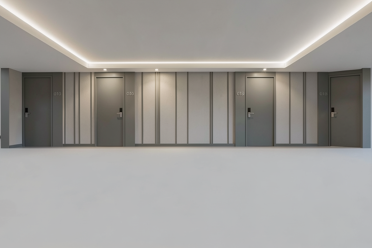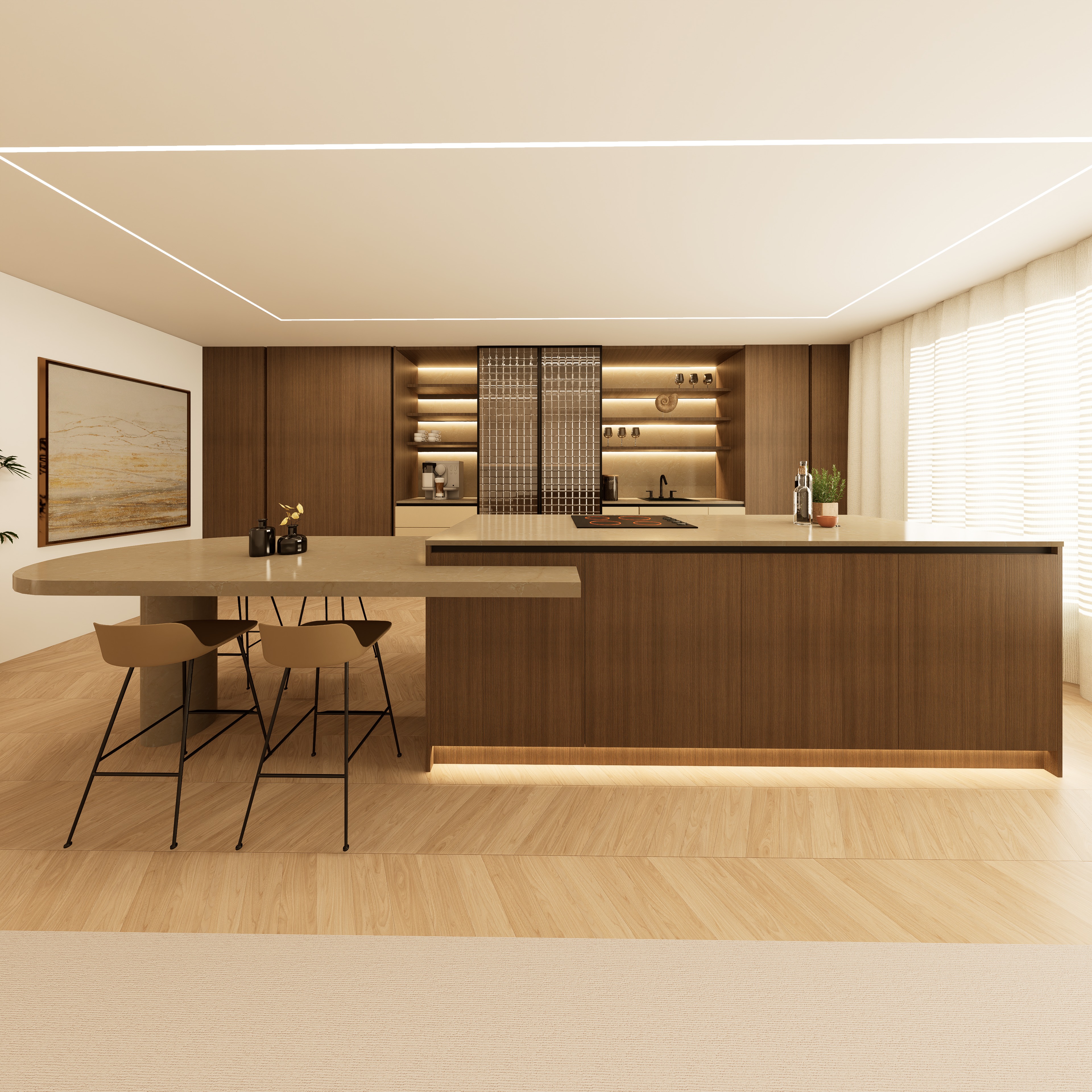 ultra realistic render of a modern warm minimalist kitchen from a frontal wide angle preserve the exact layout proportions camera position and materials from the original image do not change the design materials dark warm walnut wood panels with vertical grain matte satin finish rich natural variation beige stone countertop and backsplash with subtle texture soft cream cabinetry light herringbone wood flooring lighting soft warm indirect led strips under shelves and island base clean ceiling light lines balanced exposure realistic shadows no overblown highlights composition details keep island with integrated cooktop exactly as is maintain attached dining table extension and seating keep open shelving with minimal premium accessories glasses decor coffee setup preserve curtain light diffusion on the right side maintain black sink and faucet area exactly important glass fix the central glass panels must be linear engraved fluted glass vertical lines only not square grid not boxed pattern clean continuous vertical texture with subtle distortion and soft light diffusion realism push natural imperfections in wood grain and stone soft reflections on glass and countertop depth contrast and premium architectural mood style high end italian kitchen poliform level realism cinematic but natural
