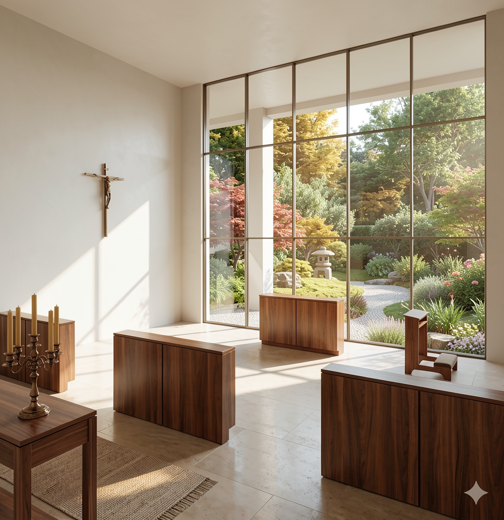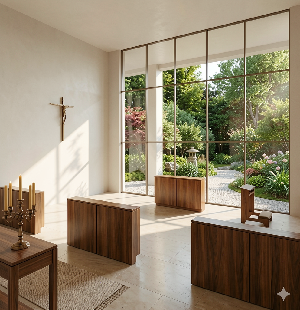 can you replace the design on the stained glass window with a stylised version of the uploaded logo take away the hebrew writing above the ark and add in a modern ner amid hanging in front of the centre of the ark
