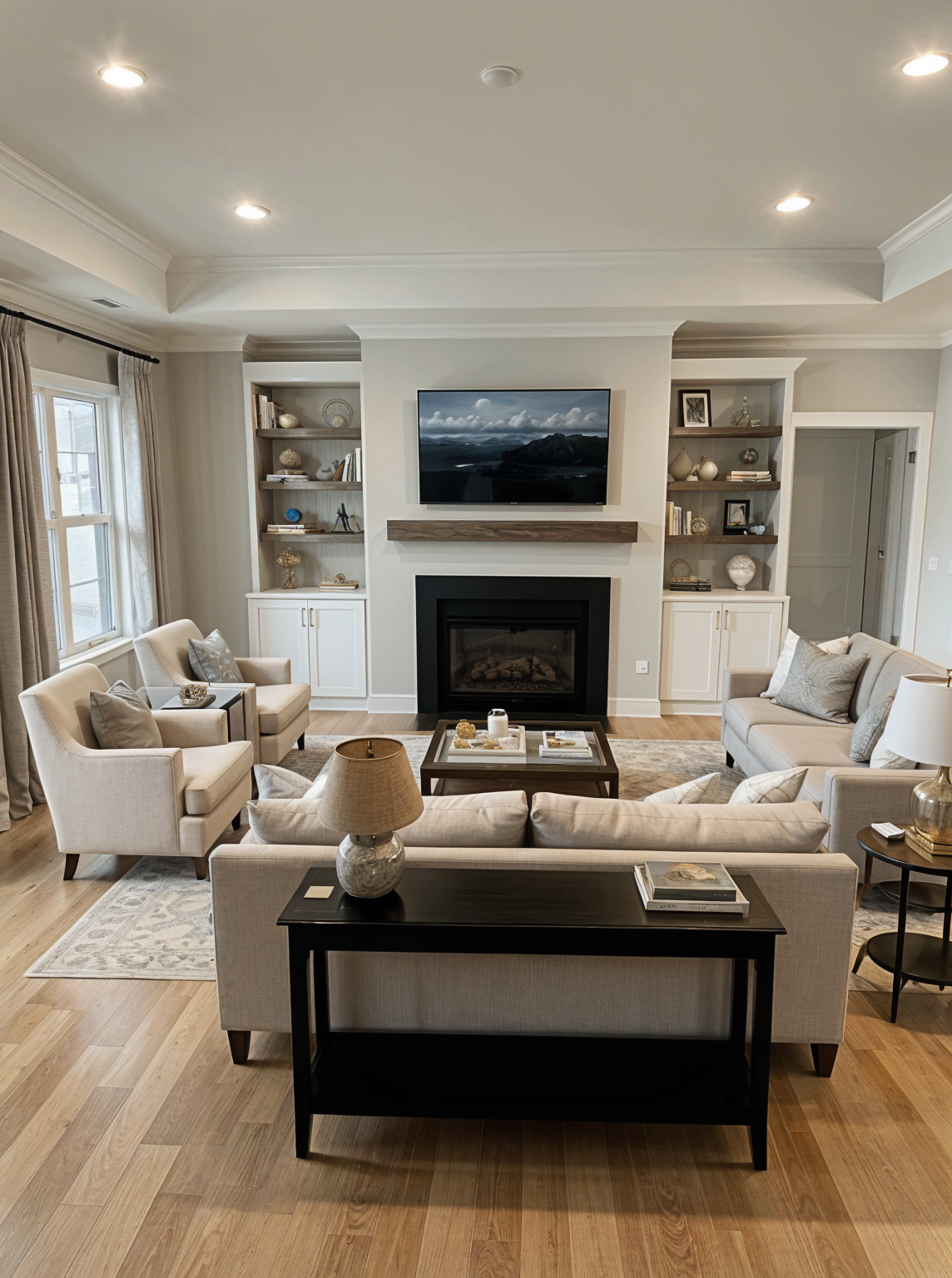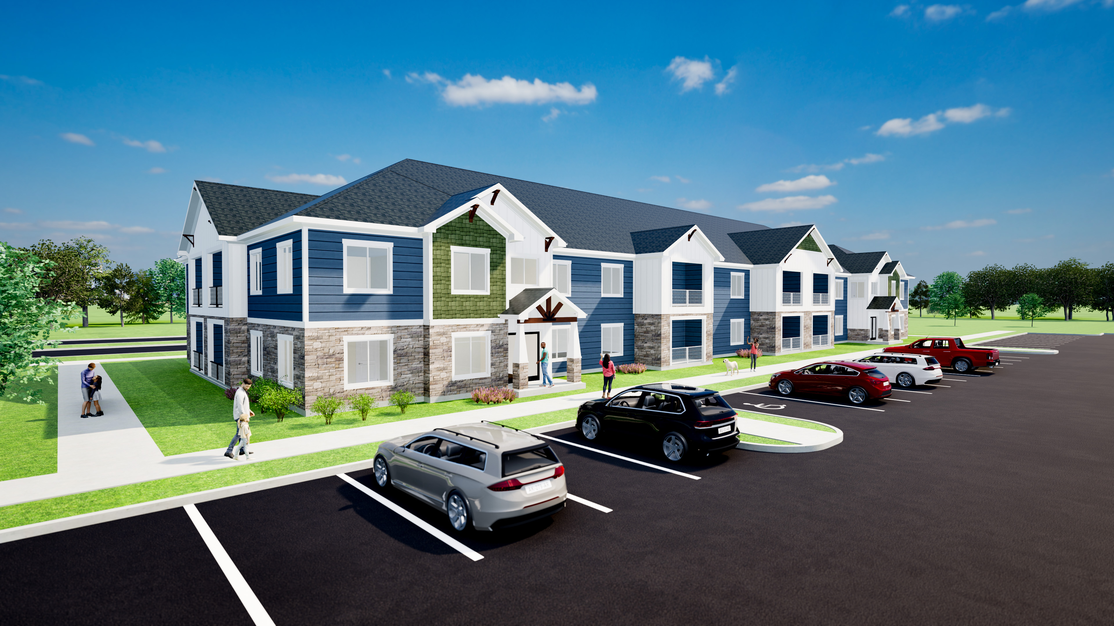 create a full color photo realistic rendering of this apartment building use a white and dark gray color scheme with a mix of lap and board and batton siding do not change structure