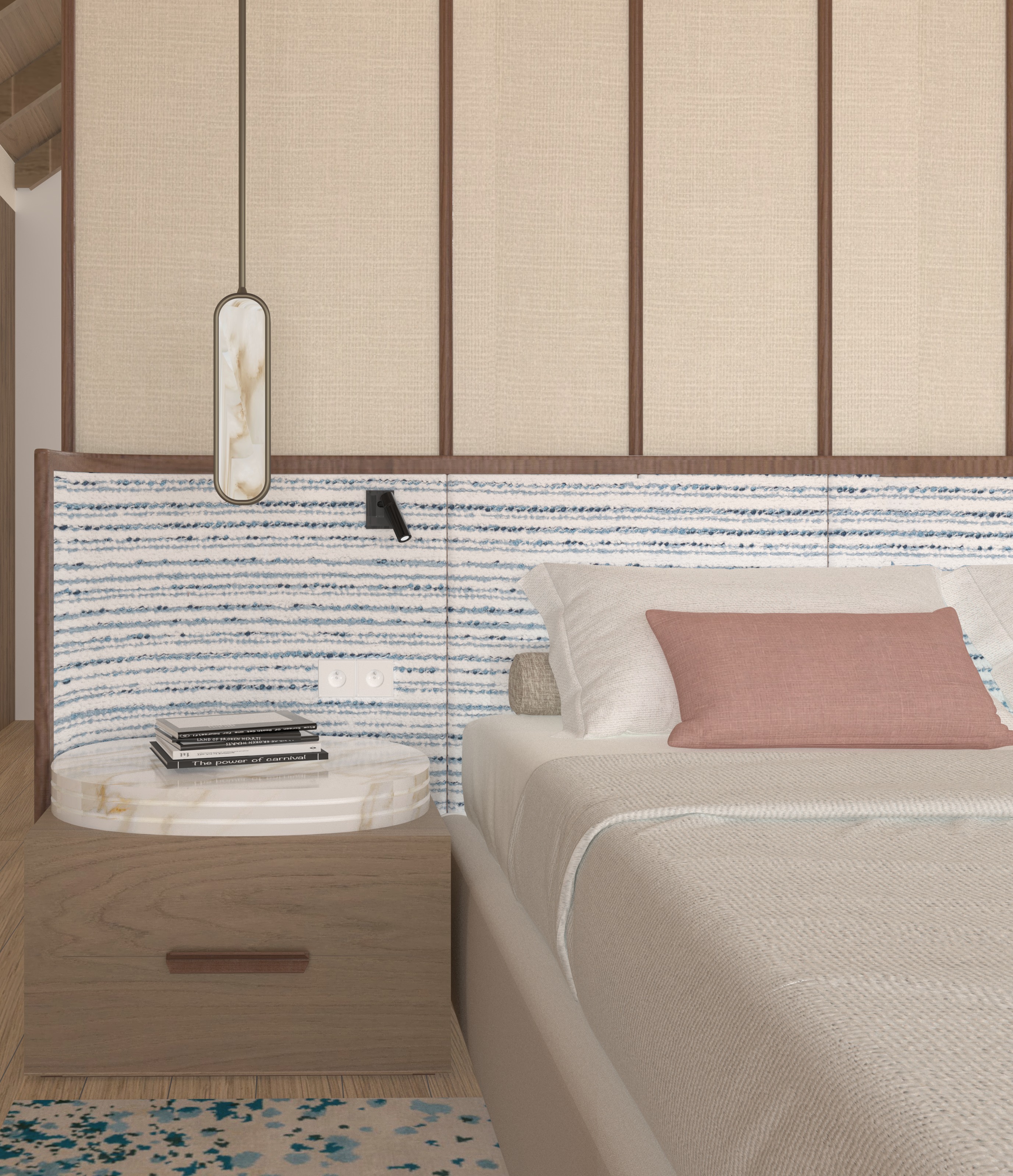 enhance this render into a soft photorealistic scene while preserving all architectural details materials furniture placement camera angle and composition exactly as shown do not change the design layout landscaping or colors