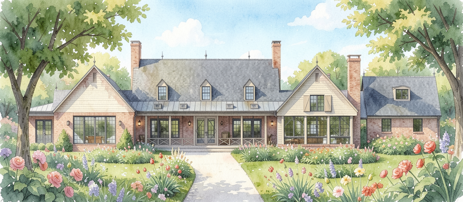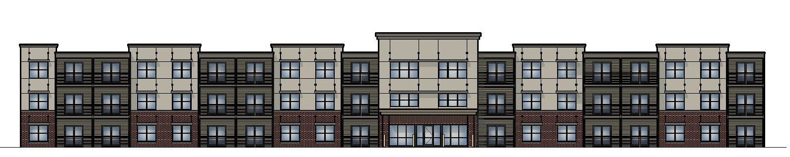 a modern apartment complex featuring a three story building with a sophisticated design the exterior walls are a mix of elegant beige and deep brick red tones accentuated by sleek black metal railings and window frames the windows are large and reflective offering a sense of openness the building is set against a vibrant blue sky with soft fluffy white clouds creating a serene atmosphere lush greenery is strategically placed around the building adding a touch of nature with rich green hues the overall ambiance is calm and inviting capturing the essence of contemporary urban living
