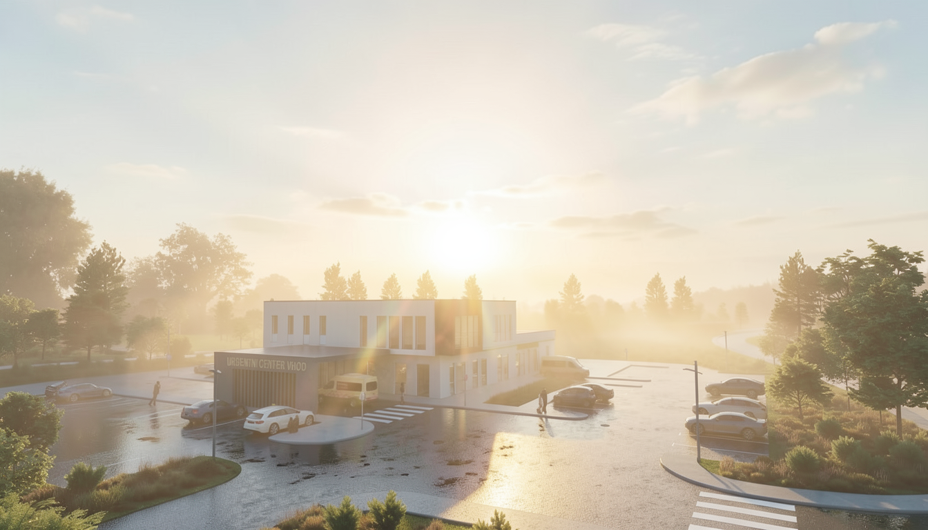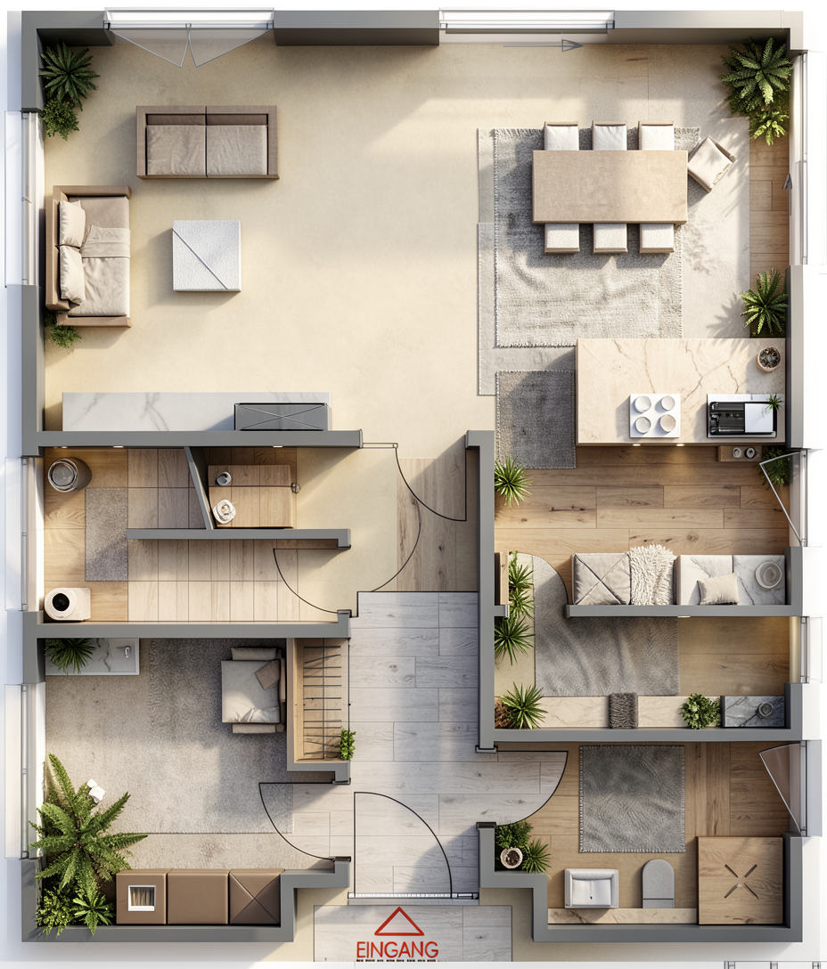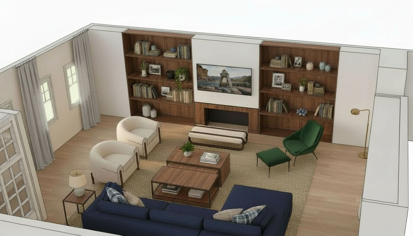 exterior shot replace the furniture pieces from the rendering with the ones from the moodboard