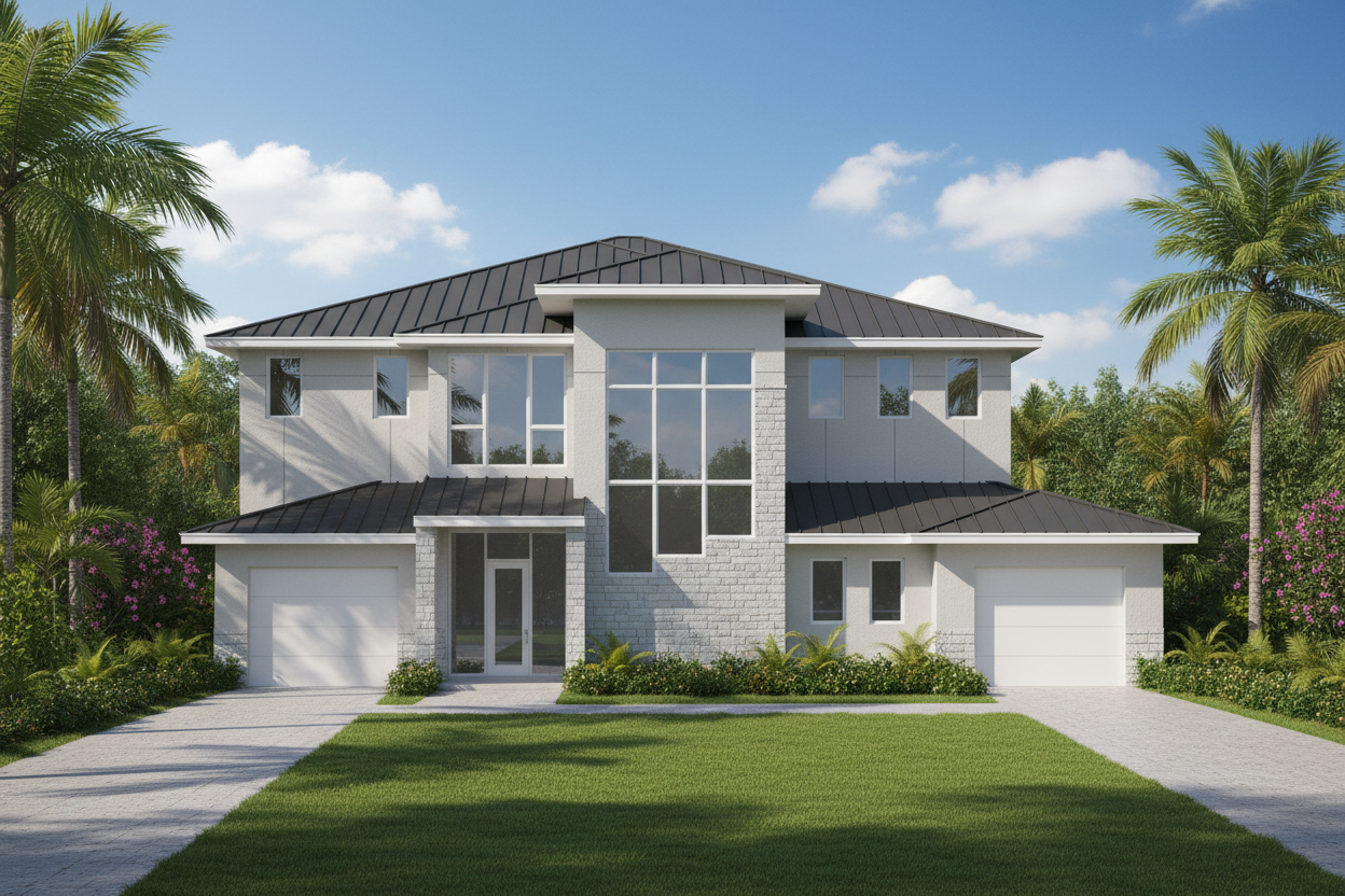 create a photorealistic front facing rendering of a two story elevated modern coastal home exactly matching the provided architectural elevation the image must be viewed from the front of the home straight on or at a slight angle no rear or aerial perspective architecture structure the entire area beneath the elevated home must be completely open supported only by exposed concrete pilings no enclosed walls storage areas or paneling under the house upper level exterior light blue horizontal siding with two double hung windows lower level left wall section above flood elevation natural or weathered vertical wood slat paneling all window and door frames including both doors and sliders must be black giving a strong modern contrast roof must be a gable roof only no hip roof using standing seam metal in galvanized or matte gray with the same pitch on both the main roof and porch roof include black horizontal railing on balcony and stairs hardscape landscaping install a solid paver driveway using light gray or ivory pavers extending beneath the home and continuing seamlessly into the backyard landscaping must be minimal clean and low maintenance with sparse coastal grasses and dwarf palms pool placement visible behind the home the swimming pool must be placed directly in the backyard behind the home clearly visible in the background of the front facing view the pool must meet all of the following specific requirements it must be a perfect rectangle it must be installed parallel to the back of the home it must be exactly as wide as the home matching the full width of the structure from left to right but not wider the pool deck and surrounding area must use the same paver material as the driveway setting location place the home on a dry inland lot on fort myers beach no water or ocean in view show nearby elevated coastal style homes to reflect the surrounding neighborhood environment lighting bright florida daytime sunlight blue sky crisp shadows overall aesthetic modern florida coastal stilt home with scandinavian minimalism shown from a front street perspective with an open concrete piling base and visible backyard pool