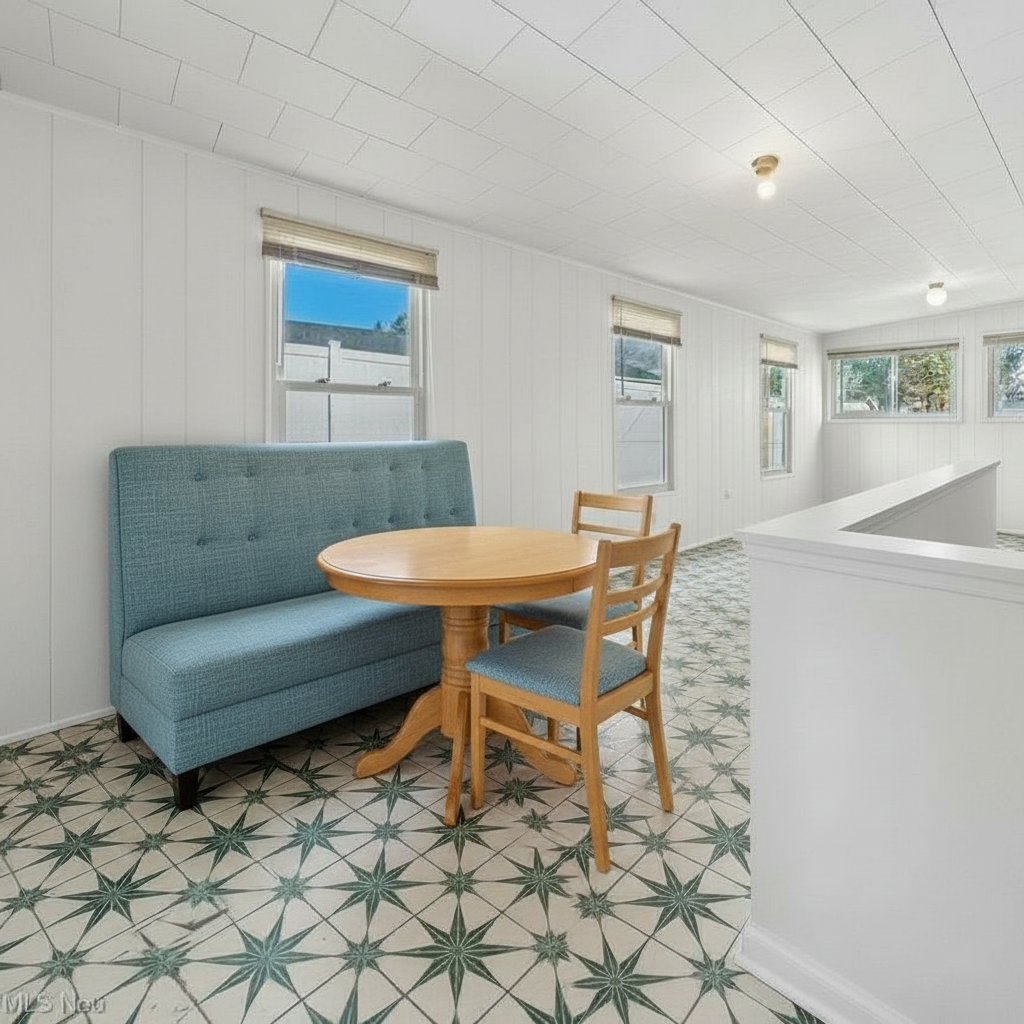 make this room look like an inviting sunroom with a small dining table in the back corner and lounge chairs