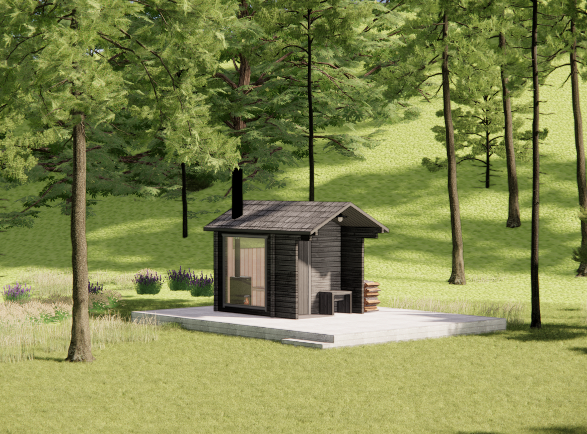 render a photorealistic 3d perspective of this house the current material style keep model geometry the same windows doors roof walls make a green meadow with moss gray several pine trees around looks native to swedsih forest do not change relief do not change the view only enhance the current materials and make the landscape nicer vegetation detailed textures in the wood siding and a vibrant clear sky with light atmospheric depth render in hyper realistic architectural visualization quality 8k resolution