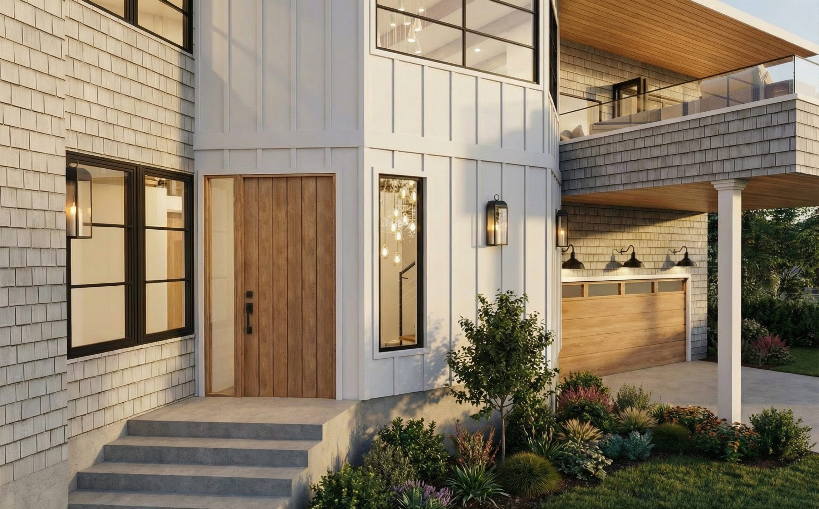 front view of a clean modern architectural exterior rendered in cinematic vibrant sunset lighting rustic architectural style vertical warm cedar siding beautifully lush green manicured landscape around structure with hedges and gardens black standing seam metal roof prominent cinematic lord of the rings shire in the distance with big weeping willow trees surrounding the house in the background high fidelity photorealistic visualization crisp shadow falloff refined facade geometry soft atmospheric depth premium architectural photography mood ultra clean composition and materials dark trim around windows concrete driveway on the left side of the house leading to the garage doors warm glow through the windows of the house