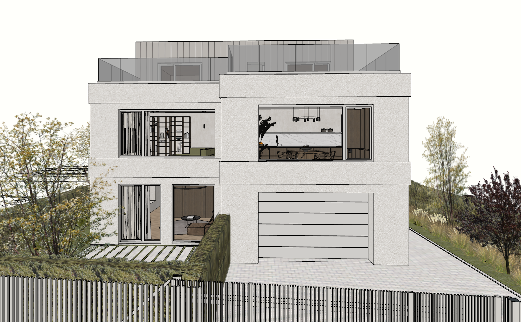 add trees make realistic house weather cozy morning light light up interior on lights used in picture preserve color on frames of windows in light grey garage door as well light grey preserve all materials in same colors as origin picture in interior is used dark wood furniture add bike infront of garage door pavement around house use a dark concrete color in bricks add more trees and greenery on the sides of house dont use lights on facade