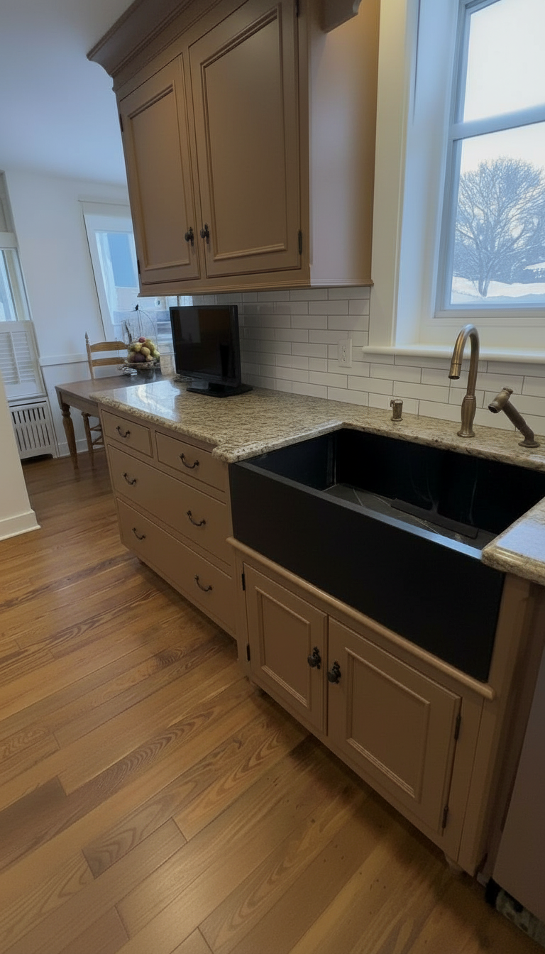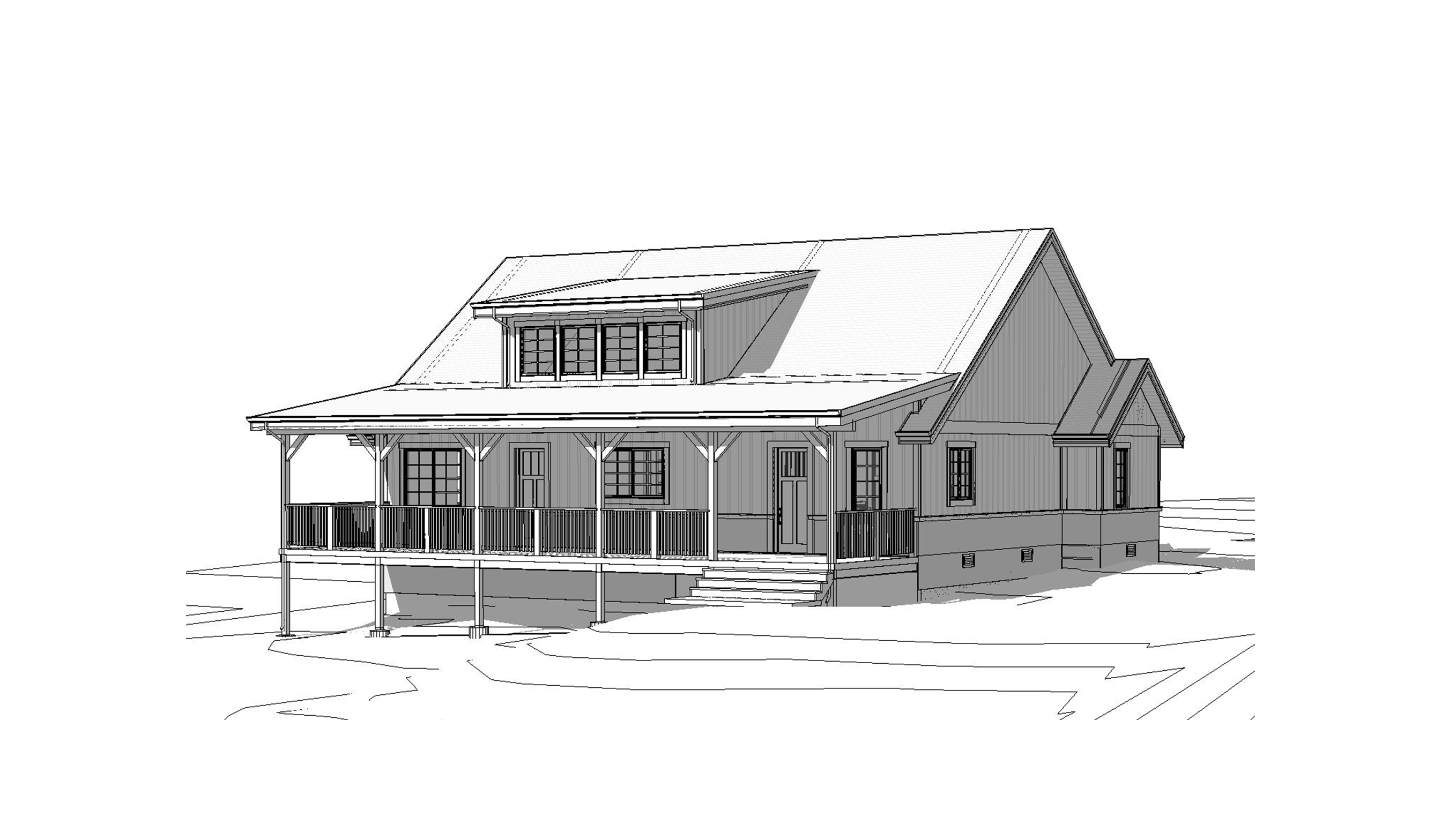 front view of a clean architectural exterior home rendered in cinematic lighting with bits of blue skies and sunlight coming through the clouds home in a coastal setting with faint streaks of light coming through trees in the surrounding area warm glow and coastal reflections off of the windows cloudy and stormy sky shining rustic select grade vertical wood siding green manicured landscape around structure with gardens and patches of grass black standing seam metal roof prominent trees in the background high fidelity photorealistic visualization crisp shadow falloff refined facade geometry soft atmospheric depth premium architectural photography mood ultra clean composition and materials black window trim flat roof photorealistic render small concrete path around the exterior of the home