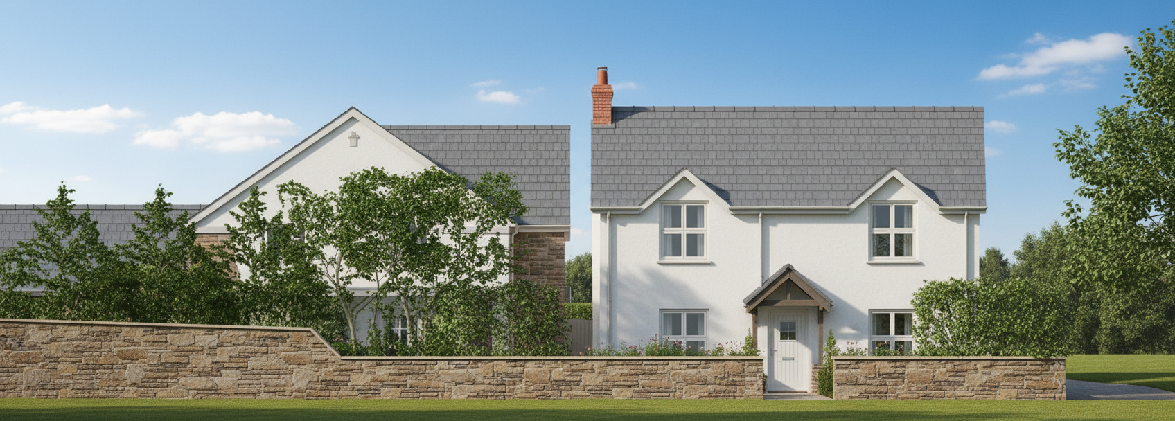 daylight white walls low stone wall forefront of building grey eaves on building no gap in forefront wall chimney stack red brick forefront wall in brown stone no gap forefront wall road in forefront with a car zoom out