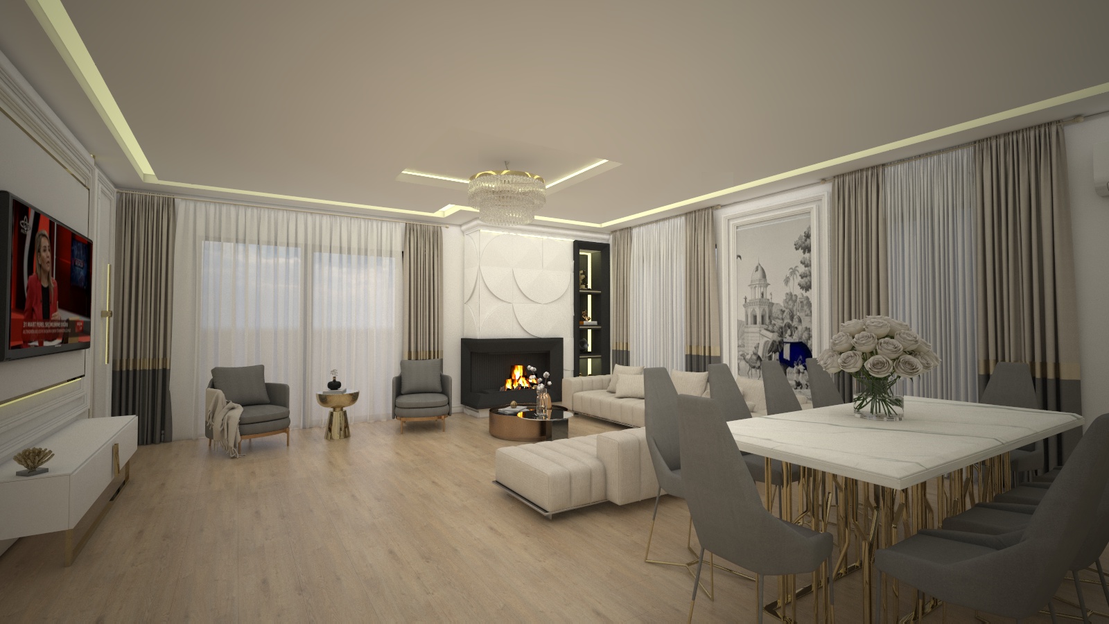 enhance this interior render to look highly photorealistic while strictly preserving the original design and composition do not change replace remove or add any objects furniture decorations or materials the layout camera angle and all elements must remain exactly the same as the original render improve only the lighting reflections material realism and overall rendering quality add natural daylight with soft shadows realistic global illumination accurate reflections and subtle depth to make the scene feel like a real photograph important there is a wallpaper on the wall do not interpret it as glass or a window do not replace it with an exterior view or scenery the wallpaper must remain exactly as it is in the original render with the same pattern color and position keep all textures materials furniture and decorative elements unchanged only enhance realism lighting balance contrast and material quality to achieve a premium photorealistic interior render