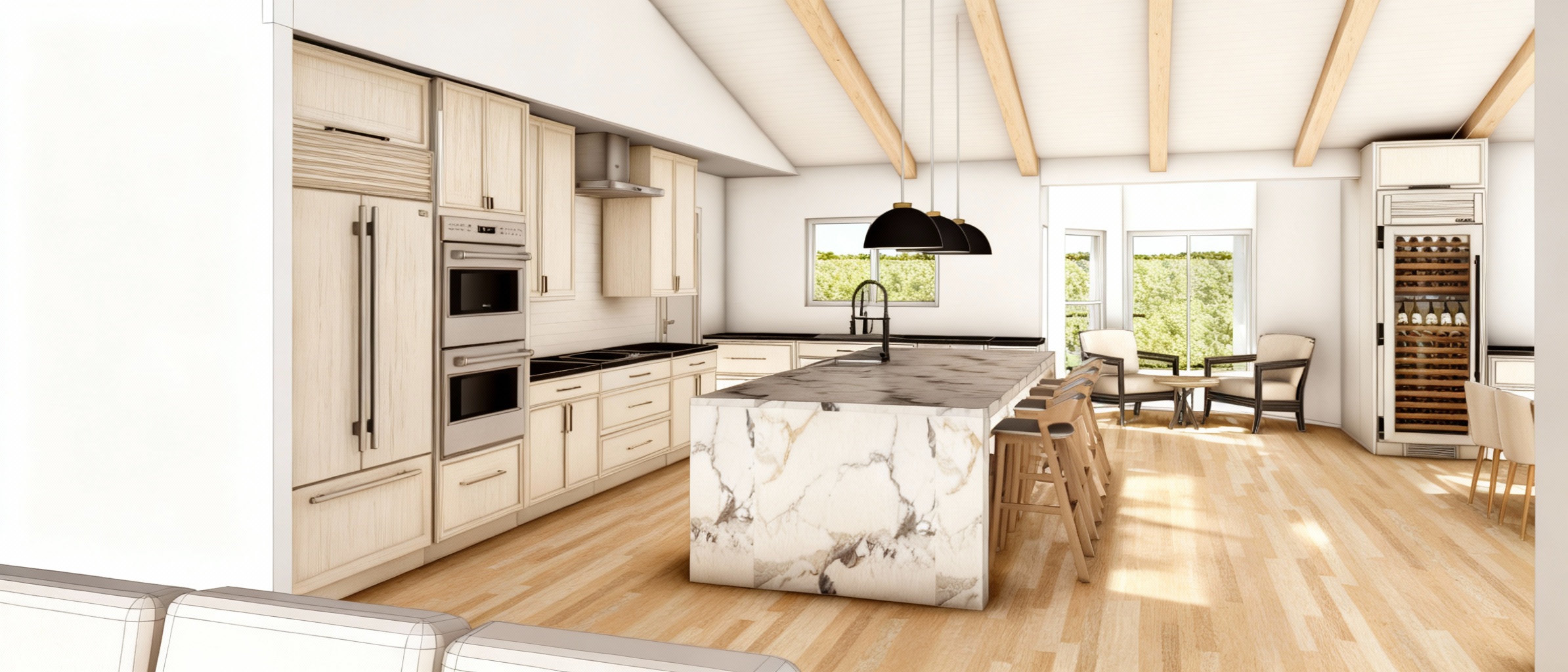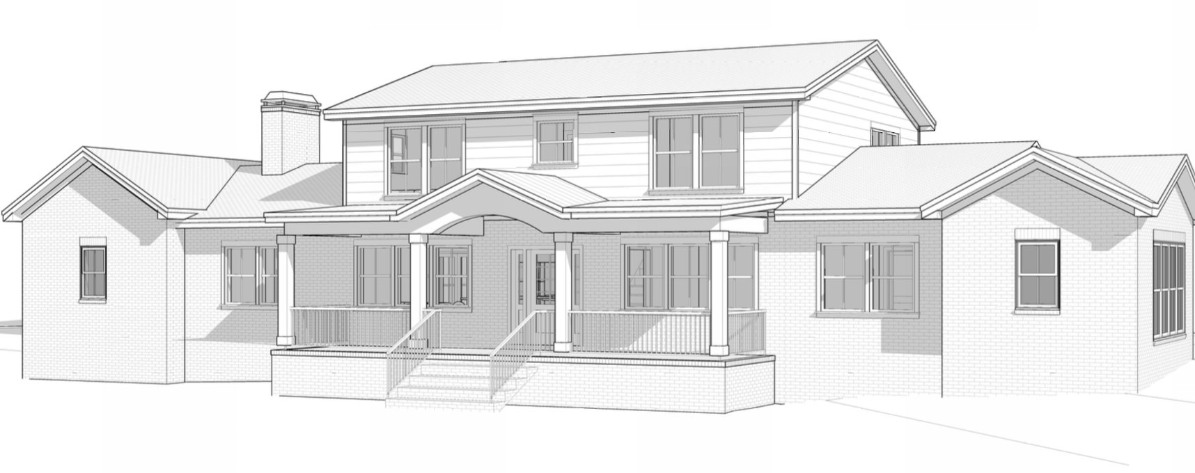 a modern farmhouse style two story home with white painted brick and board and batten siding the house features a dark gray shingle roof large wraparound porch with white decorative cross railings and white square columns it has multiple front facing gables traditional double hung windows with soft green shutters the landscaping includes a neatly manicured green lawn small shrubs along the foundation surrounded by lush green trees and set under a cloudy sky the home gives a clean elegant and welcoming rural feel