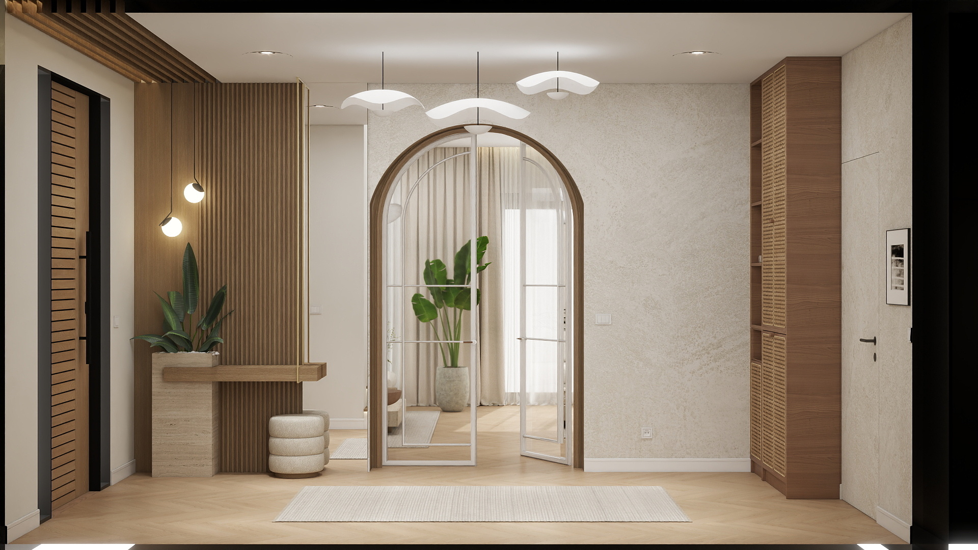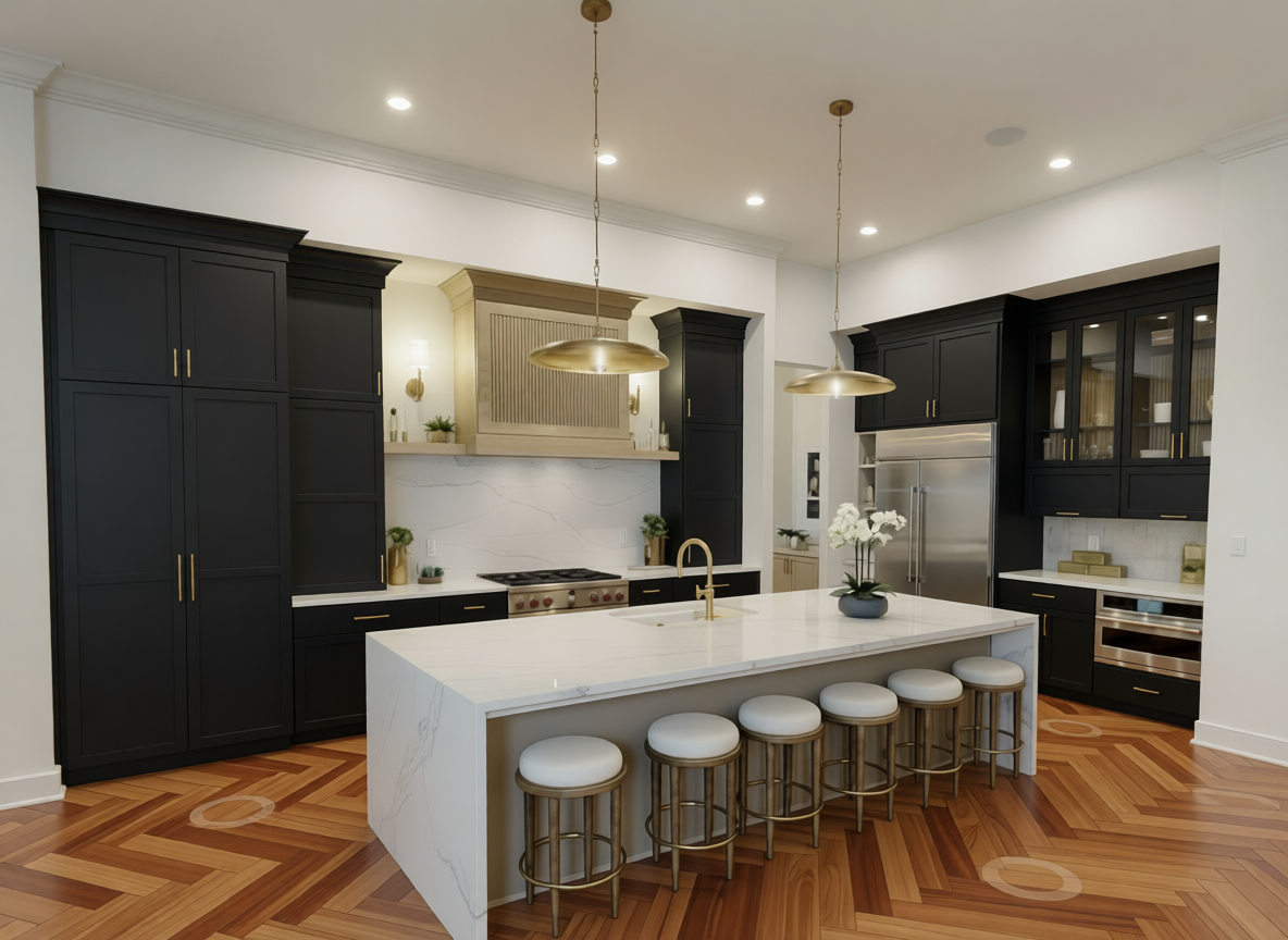 transform the provided interior image into a high end photorealistic render with warm golden hour atmosphere soft glowing highlights and relaxed upscale coastal energy while keeping everything exactly the same same proportions same colors same stone same wood same furniture same lights keep the led lights in the same position every light source should be 3000k warm light make it with contrast and dramatic effect and luxury looking