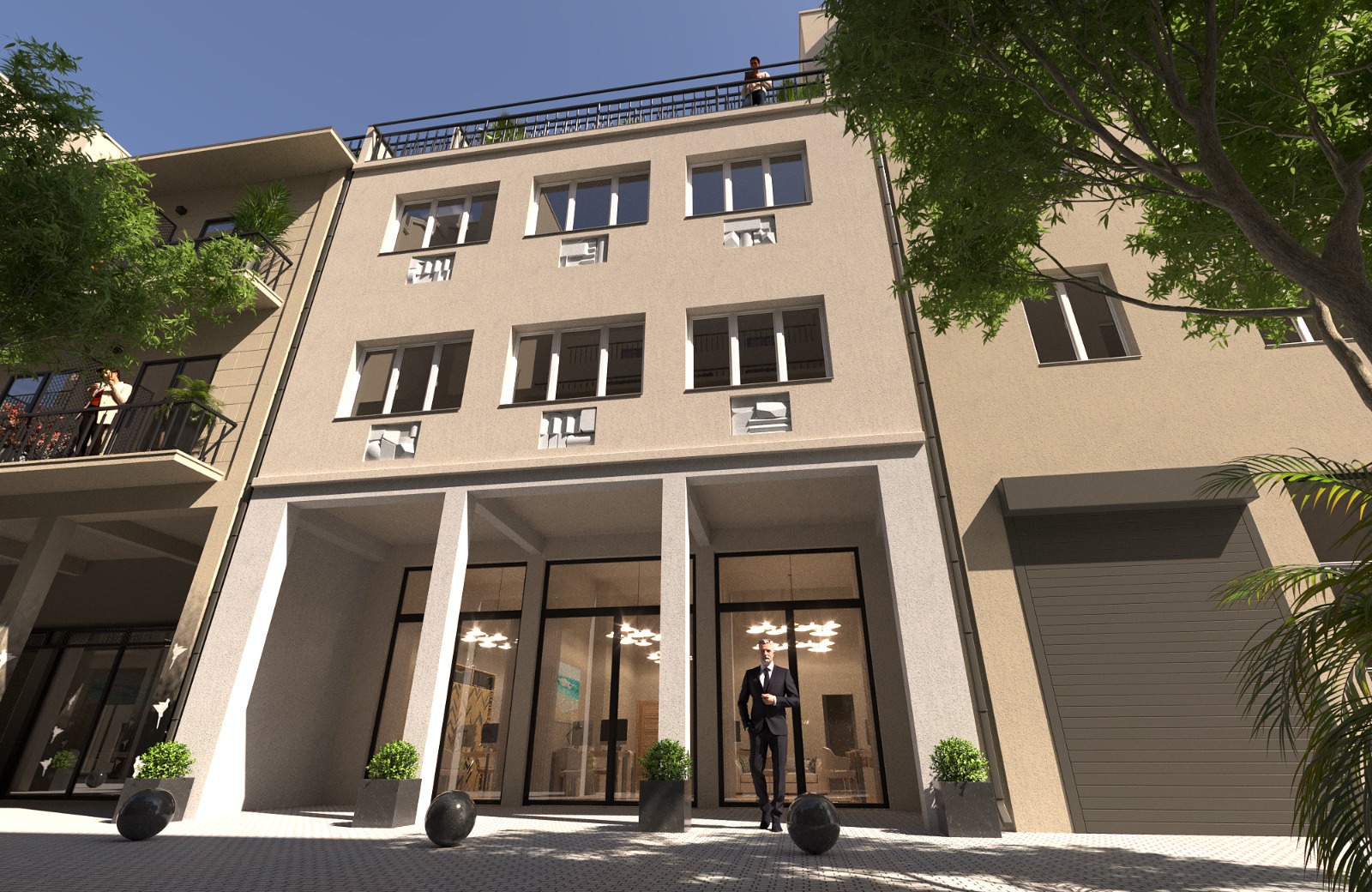 modernist exterior shot a modern urban street view featuring a clean multi story building with minimalist architecture the facade is a soft beige with large white trimmed windows and a sleek glass entrance lush green trees surround the scene adding vibrancy and contrast the sky is a clear deep blue creating a serene atmosphere subtle sunlight casts gentle shadows across the textured pavement and small neatly arranged shrubs in elegant stone planters line the entrance the overall mood is professional and inviting with a focus on elegance and simplicity architecture