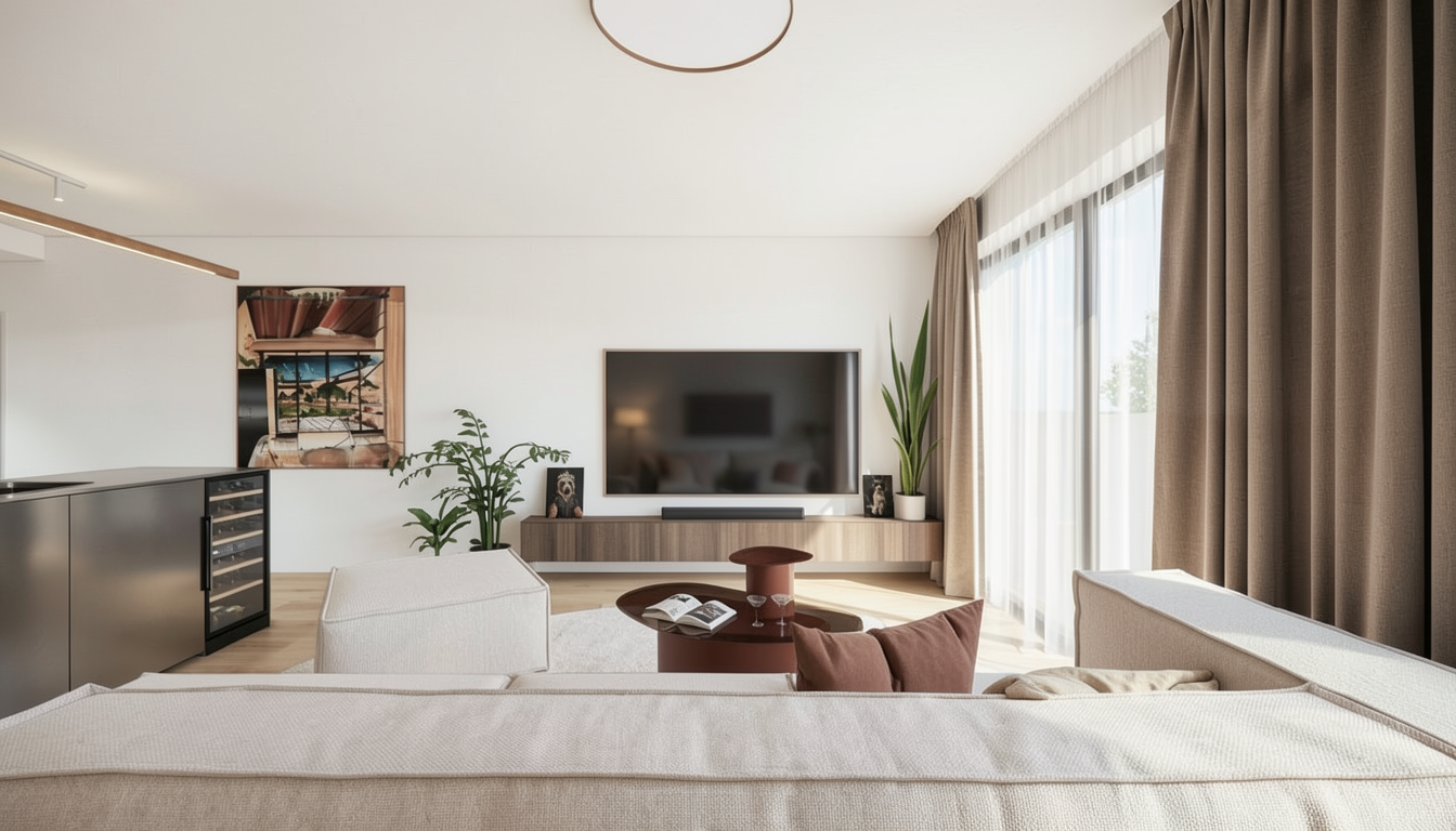 create a photorealistic 3d rendered interior visualization based strictly on the provided 2d floor plan important do not modify the layout in any way do not add remove resize or reposition any walls do not change the location size or direction of doors windows or stairs do not replace redesign or reinterpret any furniture all furniture must remain exactly as shown in the floor plan keep the exact proportions dimensions and spatial relationships the 3d render must be an accurate spatial translation of the 2d plan preserving geometry and structure precisely style modern realistic materials natural lighting high resolution architectural visualization quality the walls are painted in soft ivory providing a warm and inviting atmosphere use light oak wood for the flooring to add a touch of elegance make the bathroom with white marble tiles the windows are large allowing natural light to flood the space creating a bright and airy environment furnish the rooms with minimalist contemporary furniture in shades of warm colors and teal for a sophisticated look incorporate indoor plants with vibrant green leaves to bring life and freshness to the space