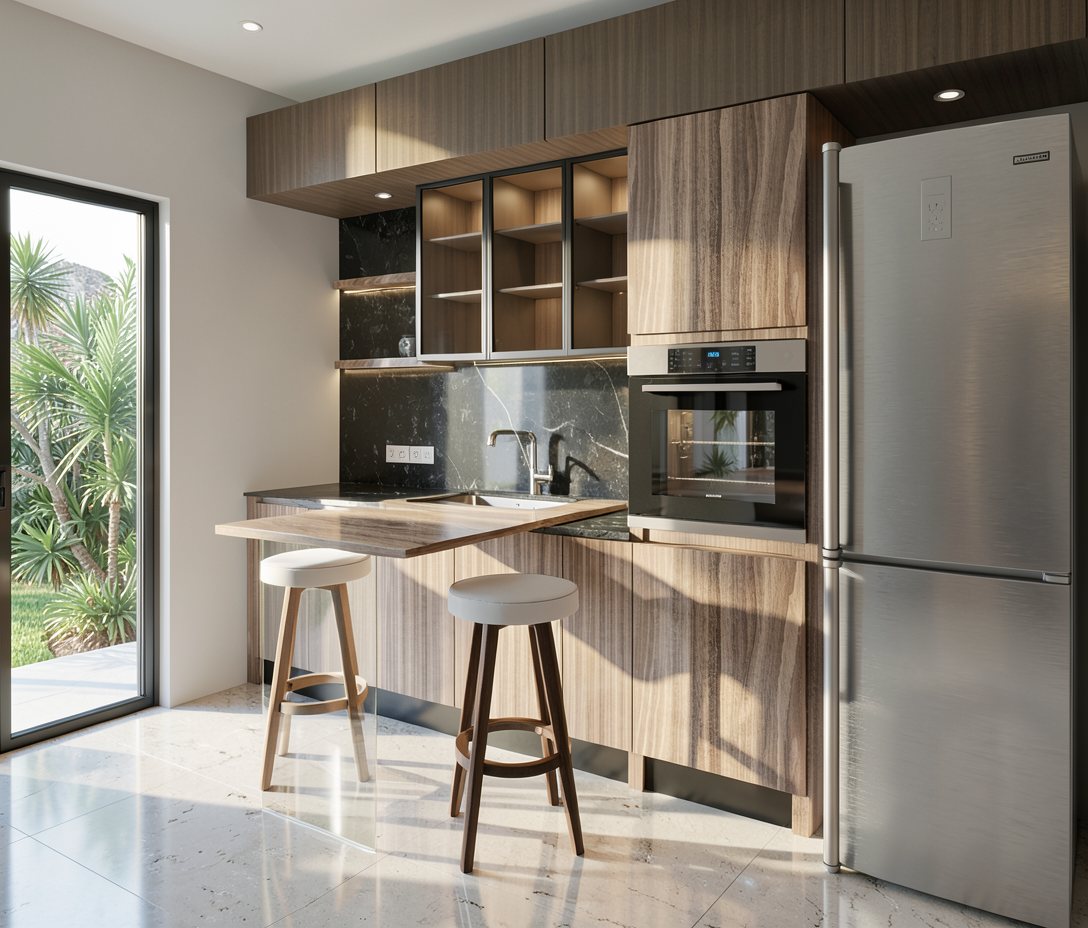 can you add a dark wooden patio and maybe enhance the sky with some clouds and rays of sun hitting the villa from the side
