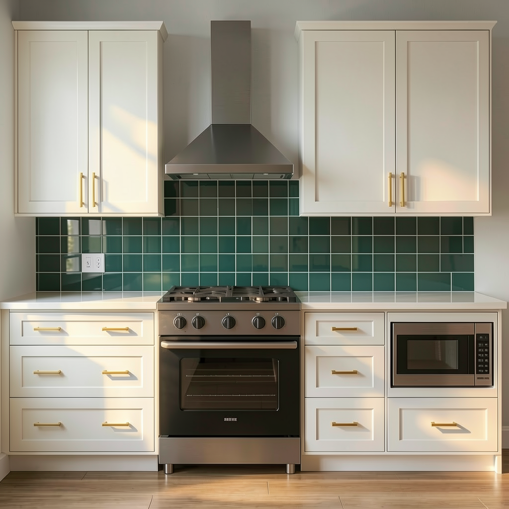 keep everything the same but change the shape of the green tile backsplash to 10 long by 2 5 wide shape instead of square