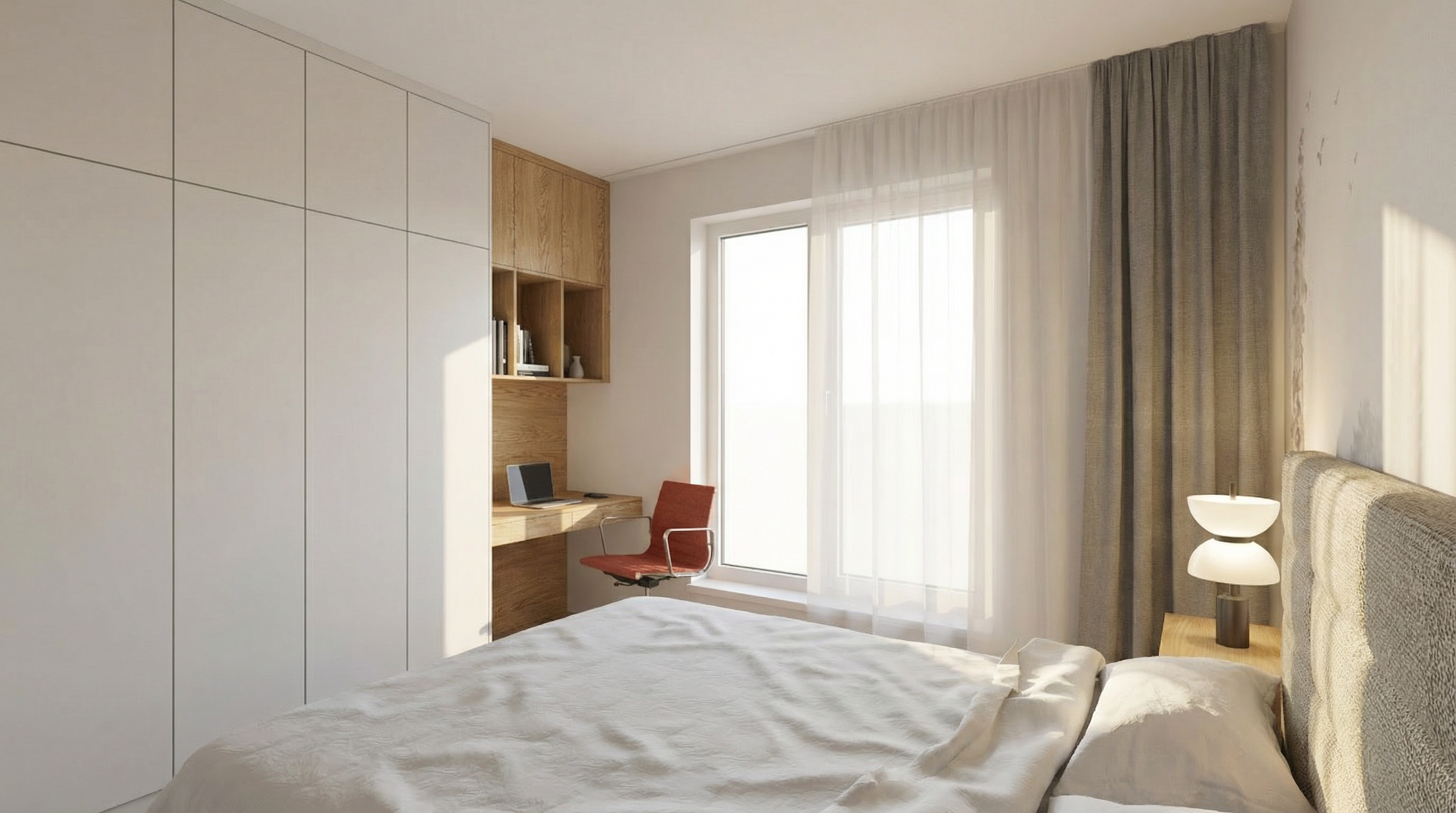 add dramatic indirect lighting to the interior install concealed led strip lighting above the right side upper counter washing light upward onto the ceiling the light should softly bounce across the ceiling and spread into adjacent areas creating gentle gradients and shadow depth rather than direct illumination maintain a cinematic nighttime mood with high contrast subtle reflections on the polished floor and realistic light falloff