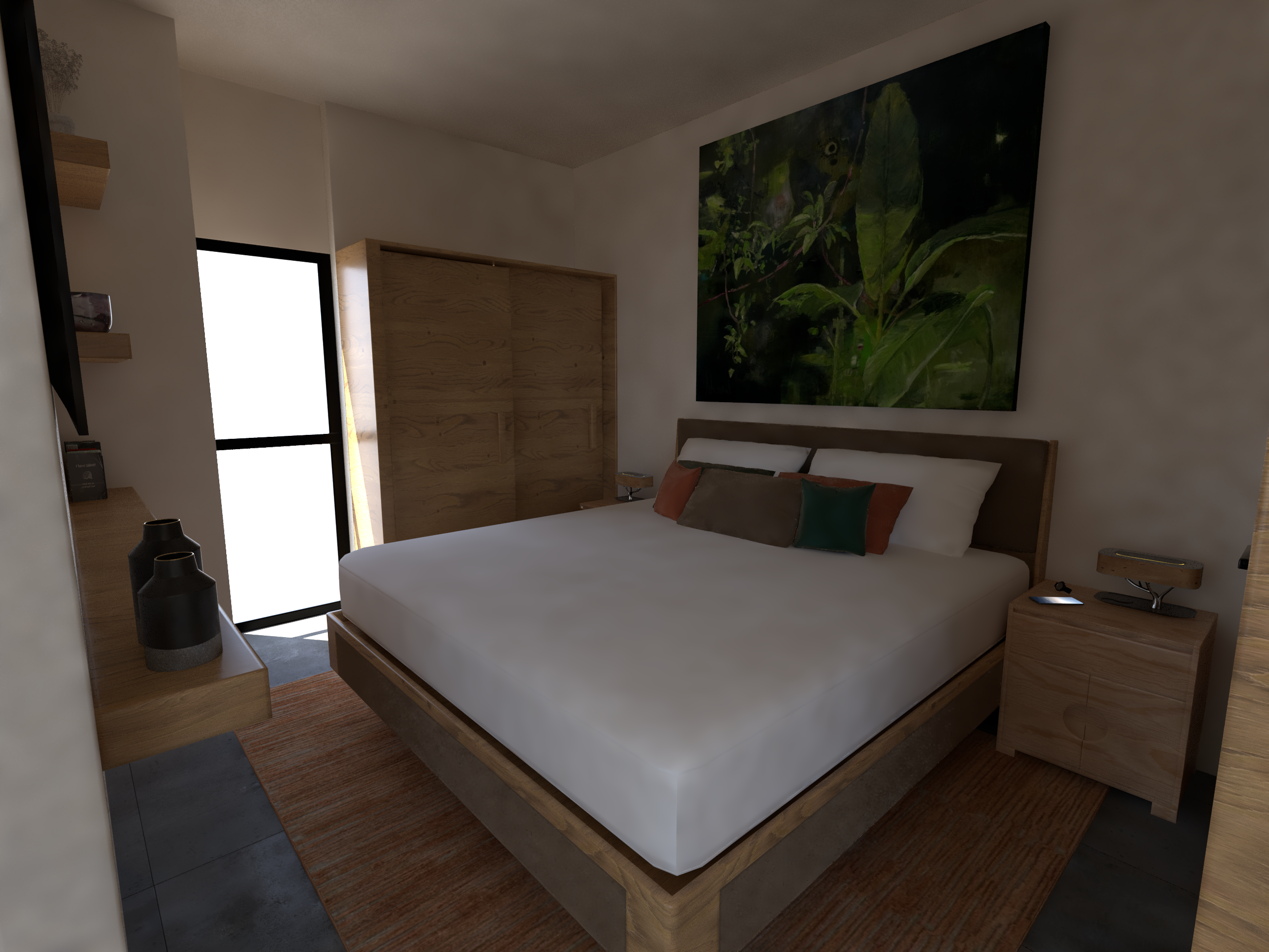 create a photorealistic enhancement of this luxury penthouse guest bedroom interior render maintain all existing furniture decorative elements wooden textures natural wood bed frame with light upholstered headboard white bedding with decorative pillows rust green cream tones wooden nightstands with warm wood finish decorative black pendant objects tropical botanical wall artwork green foliage photography wooden closet doors dark wood flooring with warm wood accent areas white walls decorative black vessels and sculptures and all architectural elements with their current colors and forms replace the window view with a photorealistic daytime cityscape of downtown puerto vallarta mexico not beachfront area showcasing the iconic church of our lady of guadalupe parroquia de nuestra se ora de guadalupe with its distinctive baroque crown topped spire rising majestically as the dominant architectural centerpiece of the skyline 23 authentic spanish colonial architecture featuring terra cotta red clay tiled rooftops and warm whitewashed facades charming old town cobblestone plaza patterns visible from the elevated perspective colorful hand painted colonial building details and ornate wrought iron railings lush tropical bougainvillea and climbing vegetation adorning historic stone structures a sophisticated blend of heritage spanish colonial architecture seamlessly integrated with contemporary mid rise residential development in the mid ground palm trees distributed throughout the downtown landscape vibrant authentic mexican old town character and cultural heritage visible from above as viewed from a high rise penthouse at approximately 18 25 floors elevation render with natural bright daylight warm golden hour color temperature approximately 4 5 pm sunlight creating rich warm illumination and elegant soft shadows across the colonial architecture 12 implement advanced vray photorealistic lighting deploy sophisticated global illumination with realistic caustics and light refraction through the window glass integrate premium hdri environmental lighting for authentic puerto vallarta tropical daylight simulation add dramatic realistic warm sunlight streaming through the window creating dimensional golden light on bedding furniture surfaces and flooring significantly enhance all material quality add realistic wood grain depth and micro textures to bed frame nightstands and flooring with authentic natural wood color variations and subtle aging characteristics enhance white bedding with detailed cotton fabric weave micro textures showing realistic light absorption and soft dimensional shadows in folds and around decorative pillows render decorative pillows rust green cream with appropriate textile finishes showing realistic color saturation and light interaction add sophisticated surface details to wooden closet doors with realistic wood grain and hardware finish enhance black decorative vessels and sculptures with matte finishes showing realistic light absorption render botanical wall artwork with photographic realism showing natural leaf texture and color depth add subtle surface imperfections to white walls with realistic paint micro texture and warm ambient light modeling improve lighting dynamics create dramatic warm directional light from the window casting sophisticated shadow patterns across the bed and bedroom surfaces add soft fill light bouncing from warm wood tones creating elegant ambient illumination implement proper light interaction with textile surfaces bedding showing realistic fabric behavior and dimensional folds under directional light enhance window reflections showing the puerto vallarta cityscape and sky add subtle reflections on dark flooring from ambient and directional window light render the black decorative objects with realistic shadow modeling and light absorption apply premium color grading with warm serene sophisticated bedroom ambiance refined luxury guest sanctuary with inviting natural light implement realistic ambient occlusion for shadow depth in all corners and architectural details include subtle cinematic depth of field with primary focus on the bed area ensure overall aesthetic conveys a luxury penthouse guest bedroom with museum quality architectural design and refined natural lighting final render must achieve premium architectural interior photography quality with 8k resolution clarity and refined contemporary styling