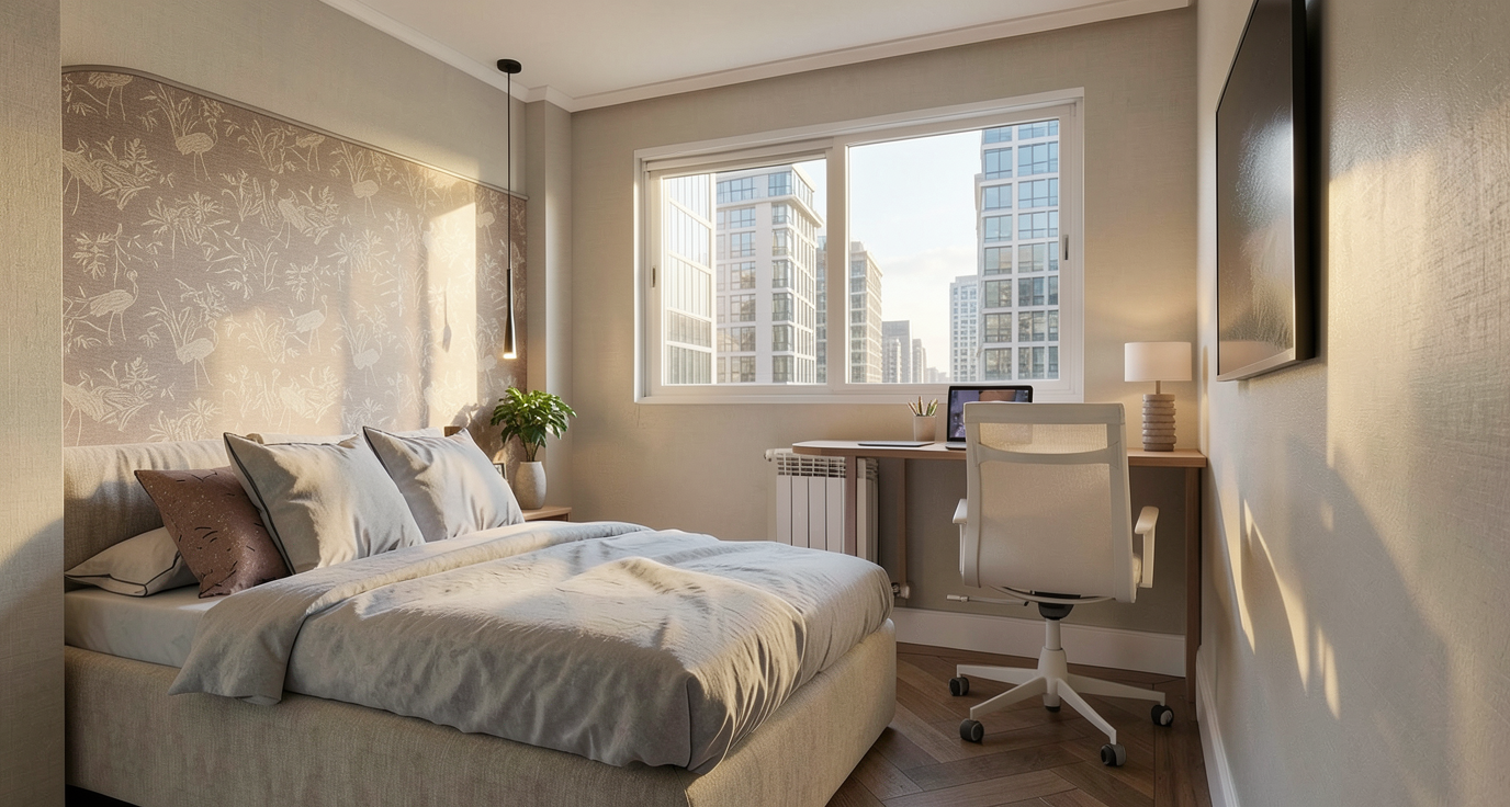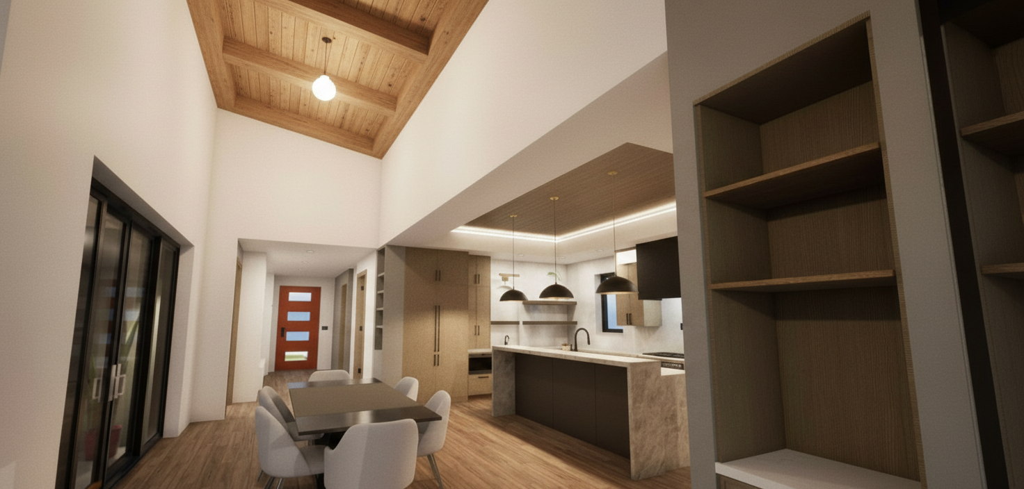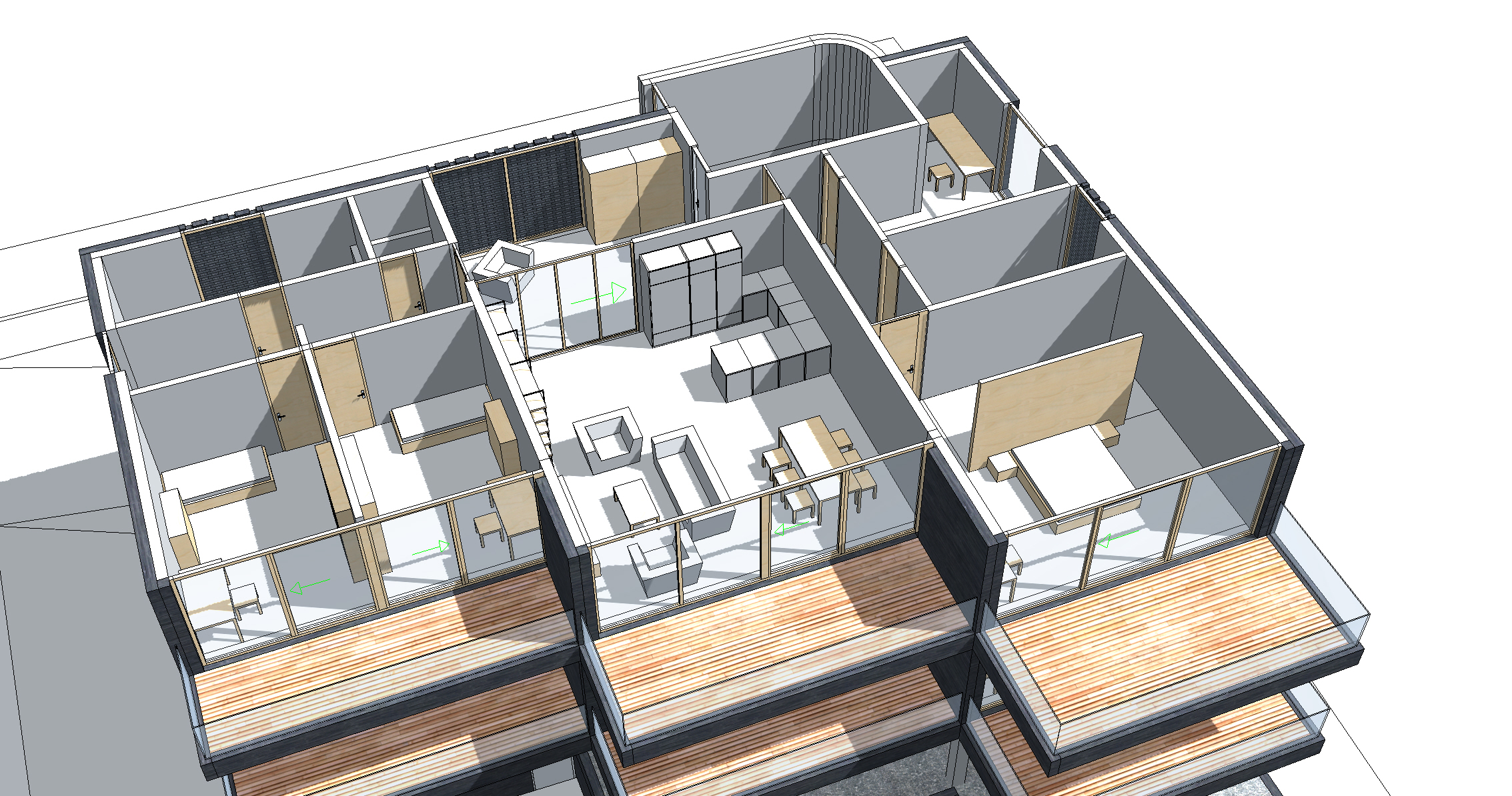 modern house in city houses around dark grey bricks light wood grass and trees around