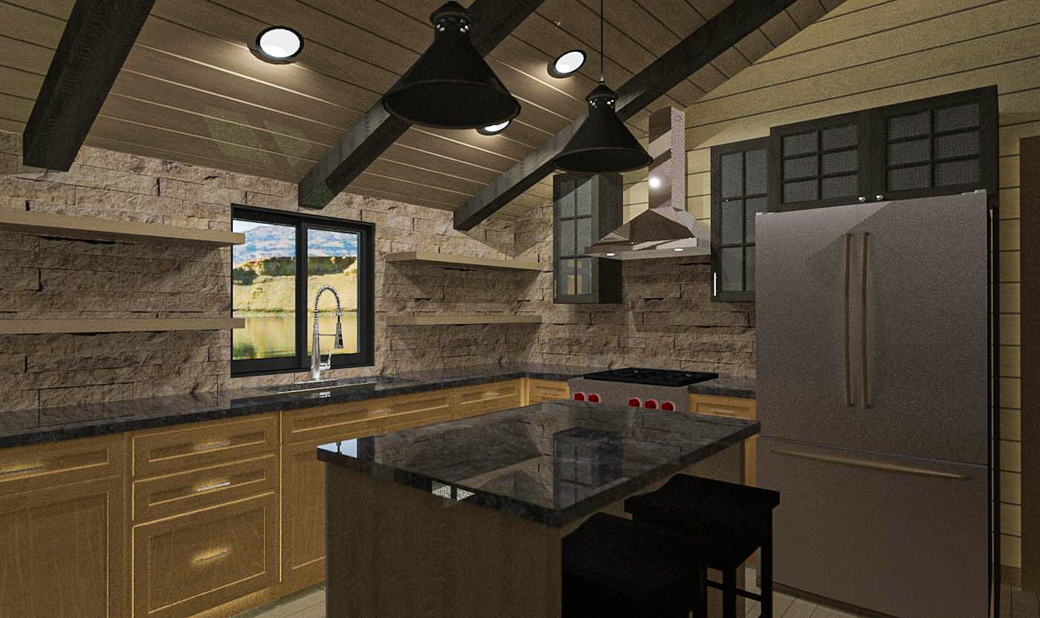 interior shot make this happen photorealistic add some decorative bowls and cups on the shelves