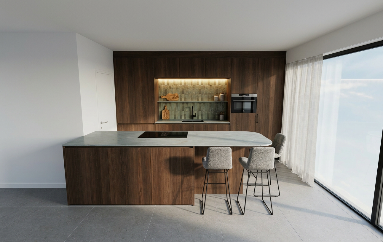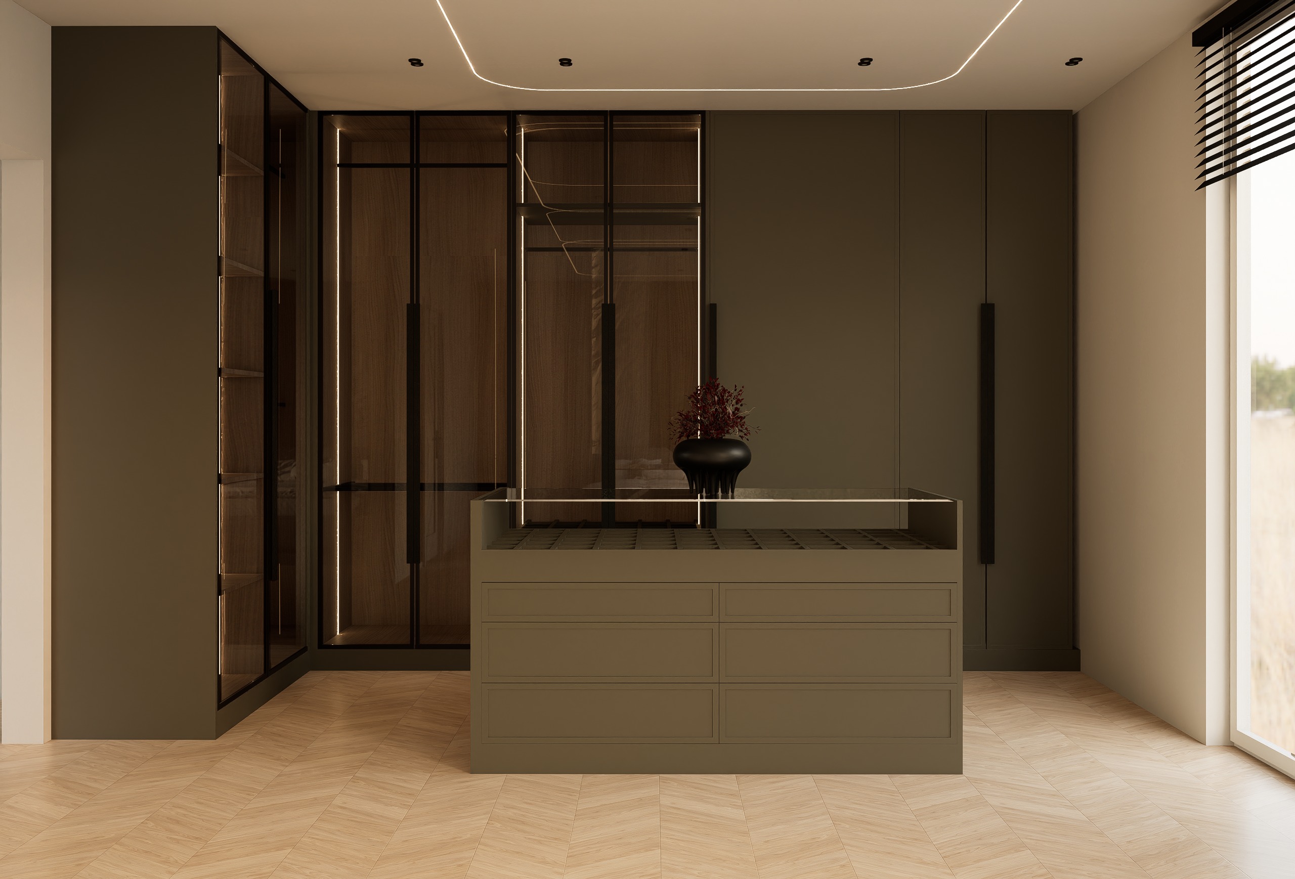 create an ultra photorealistic high end interior render of this walk in wardrobe space preserve the exact original design architecture layout cabinetry proportions island dimensions ceiling detail lighting placement floor pattern and camera composition do not redesign or move anything the goal is to make the existing render look fully real luxurious and editorial grade push the realism to a very high level physically accurate lighting and global illumination soft natural daylight entering from the right side window warm integrated led lighting inside the wardrobe realistic bounce light contact shadows and soft shadow gradients subtle cinematic contrast with refined highlights realistic lens response depth and premium interior photography feel material realism must be extremely strong dark wardrobe panels in deep warm charcoal bronze grey matte lacquer with soft sheen smoked glass doors with realistic reflection transparency and slight depth warm walnut wood interior with rich natural veneer grain subtle variation and luxury finish black metal framing and handles with elegant satin finish island with realistic painted finish and glass top with correct thickness edge reflection and clean specular highlights light oak herringbone floor with authentic grain natural tonal variation and realistic plank definition add realistic clothes inside the glass wardrobe to make the space feel lived in and premium a curated selection of elegant hanging clothes in luxury neutral tones sand taupe cream black graphite warm grey muted brown include a few structured jackets shirts long coats and neatly arranged folded pieces keep the wardrobe styling minimal and expensive looking do not overcrowd the closet garments should be naturally draped correctly scaled and softly visible through the smoked glass enhance the realism of all small details improve the vase and branches on the island so they look truly physical and high end refine glass reflections and interior shadows add subtle imperfections only where needed for realism never making the scene messy keep edges sharp and premium not soft or blurry make the render look like a luxury interior photography shot from a top architecture studio overall mood calm luxurious sophisticated warm minimal cinematic editorial ultra high end residential interior visualization negative instructions do not change the design do not change cabinetry layout do not change materials into different colors do not add new furniture do not alter the ceiling lines do not change the island form do not overcrowd with styling do not make it look artificial or overprocessed