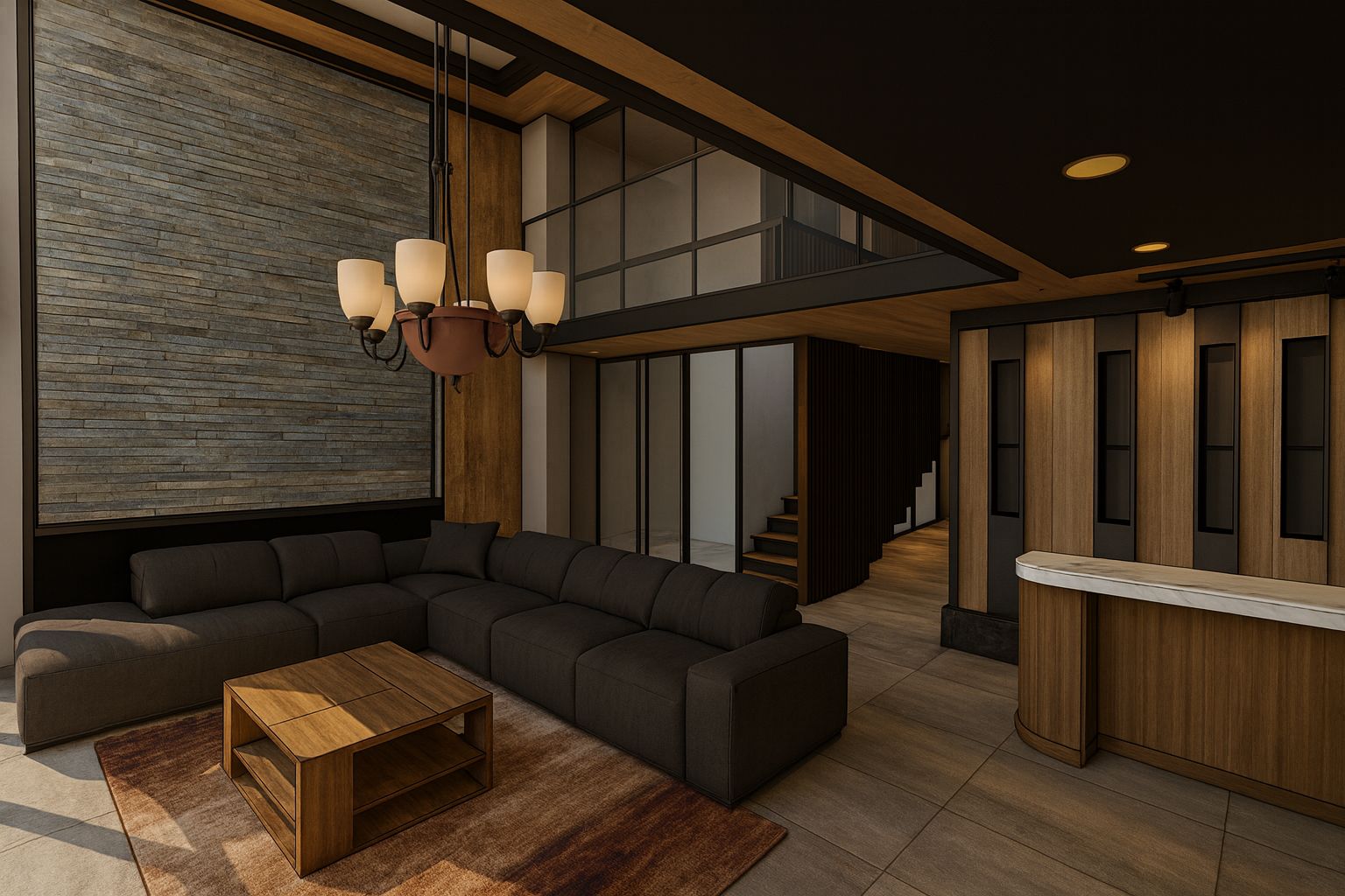 render an elegant contemporary living room with a warm inviting atmosphere the room features a dark charcoal sectional sofa positioned around a walnut coffee table on a gradient brown rug the backdrop is a slate gray stone accent wall providing a textured modern look a wooden ceiling with warm recessed lighting casts a cozy glow the left wall has expansive modern glass windows allowing natural light the right side of the room shows a sleek wooden panel wall with dark inserts suggesting a high end stylish feel the staircase is tucked in the background featuring rich wooden steps illuminate with a central elegant chandelier to complete the sophisticated ambiance the wall beneath the staris should be wooden not dark add some led light and the wall made of masoneru should have more medium size stones