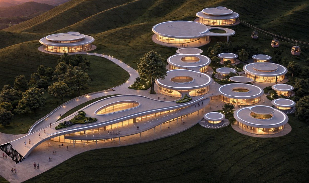 modernist exterior shot can make the roof based on the sketch bottom leftt slope not too high and add people walking up and add ponds and then change roof to philippine setting the circle ones architecture