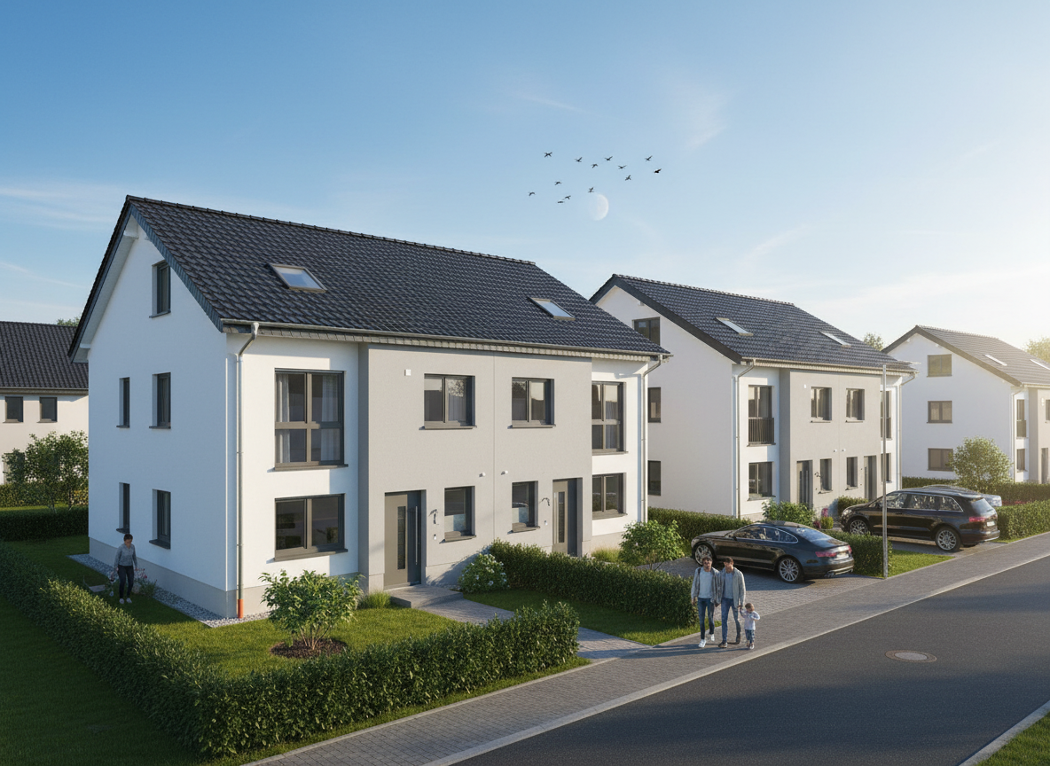 render a modern hillside house with a rustic stone lower facade and sleek wooden upper section incorporate large glass windows reflecting the surrounding forest set in a serene lush green woodland with dense vibrant green trees the roof is dark and contrasts with the earthy tones of the stone the sloping ground is covered in warm golden brown grass dotted with rich green ferns capture a tranquil and harmonious atmosphere with soft natural daylight illuminating the scene makte ultrarealistic render with little bit more dull lights and a little fog make the wood color grey brown little bit older planks the windows should be less see through and the stone should be litttle darker