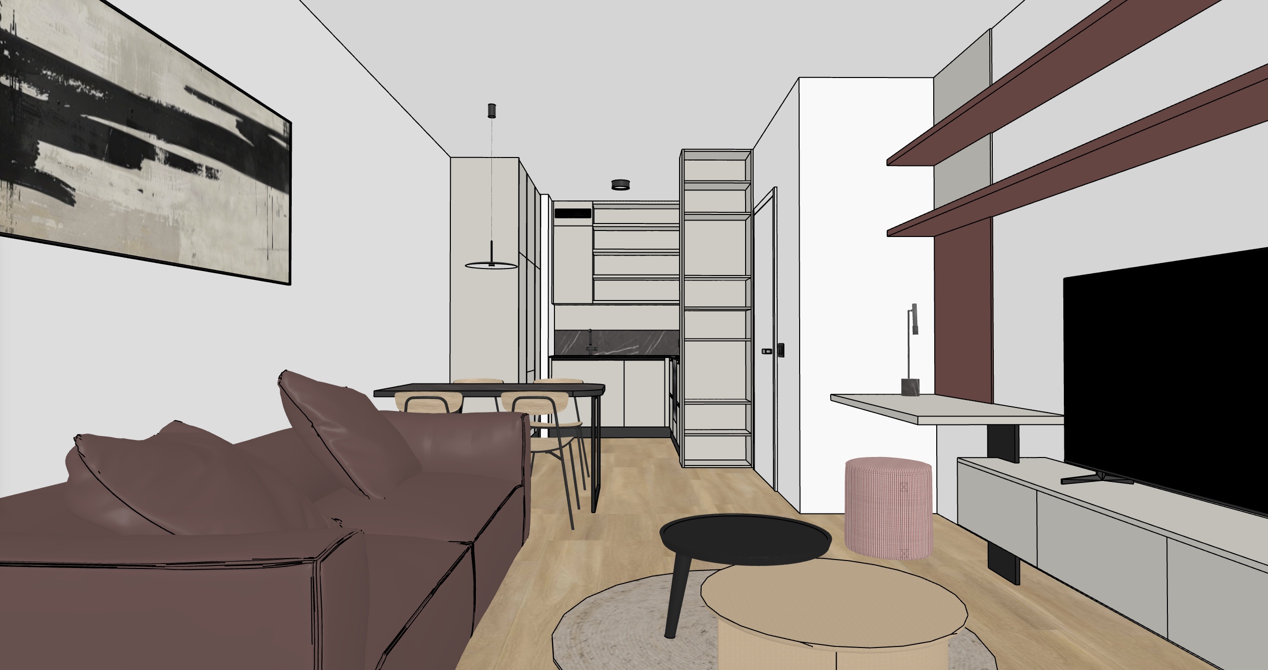 modern city living room matt finishes floor lamp switched on natural daylight light coming through large windows white walls tv wall in grey beige matt finish with red taupe shelves on the wall light oak wooden floor crisp details and nice textured on the upholstery
