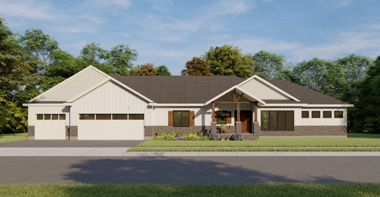 render a beautiful suburban house with a cream colored exterior and dark brown roof shingles the stone base is a textured gray complementing the wooden accents and trims in a warm walnut color the lush garden features vibrant purple and yellow flowers set against deep green grass surround the scene with rich green trees and a sky filled with soft wispy clouds creating a peaceful and inviting atmosphere