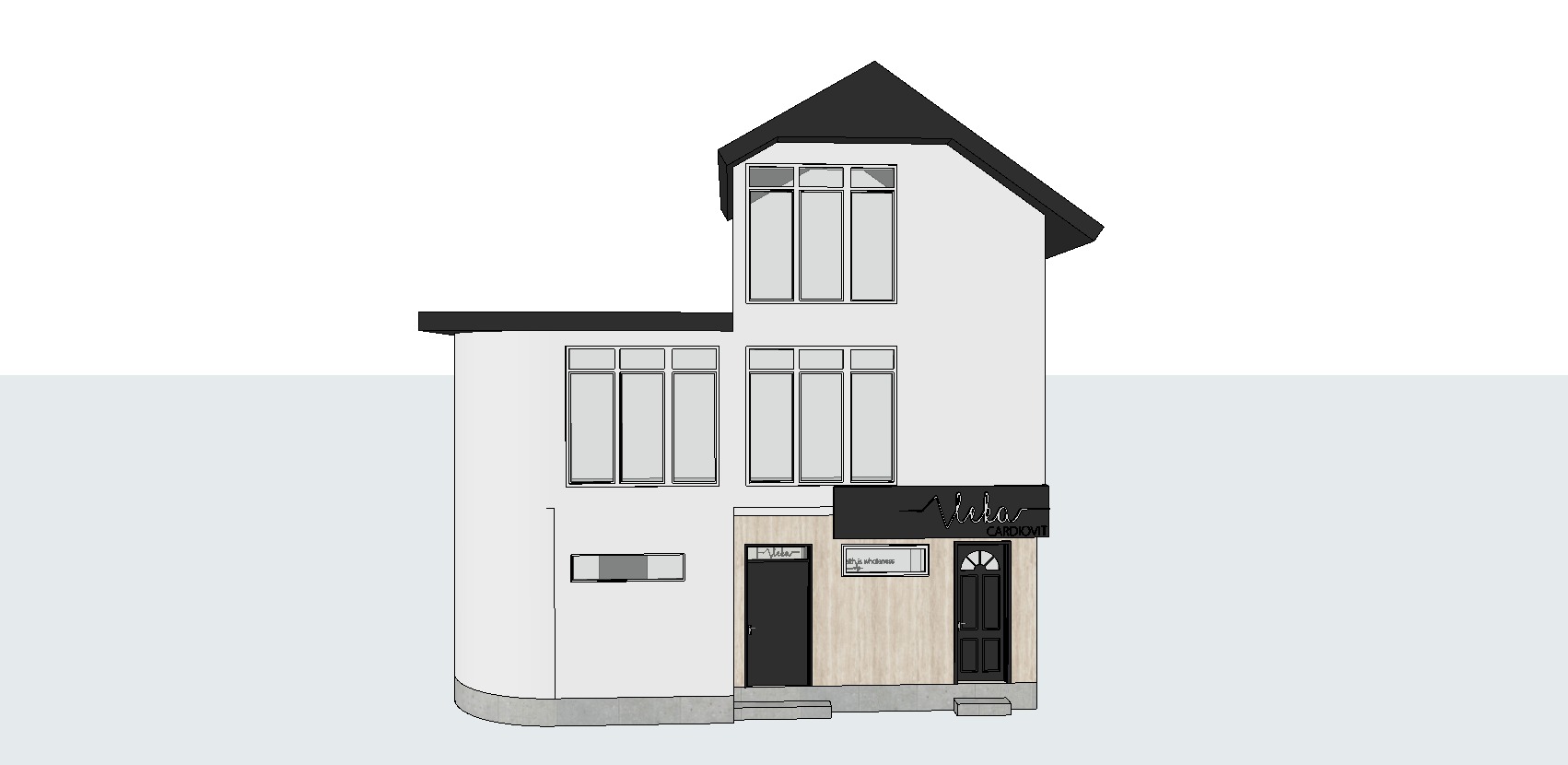 modernist exterior shot i have a facade design of a mixed use building the ground floor is a cardiology clinic medical ordinance and the upper two floors are residential apartments the overall building shape volume roof windows balconies and proportions must remain exactly as in the original design do not change the building geometry in any way i want to redesign only the ground floor facade below the second floor window line to clearly differentiate the cardiology clinic from the residential floors above general requirements keep the entire building form exactly the same do not change window sizes positions balconies roof or structure the upper two floors must remain residential in appearance and unchanged only redesign the ground floor facade treatment ground floor design concept the ground floor must clearly read as a modern professional cardiology clinic use contemporary materials such as modern grey ceramic tiles natural or engineered stone panels in grey tones subtle modern brick texture architectural facade panels with clean minimal detailing the design should be elegant minimal clean and suitable for a medical clinic visually enhance the entrance without changing its size or position make the clinic level visually distinct from the residential floors above logo instructions the logo graphic itself must remain unchanged same identity and form the black background part of the logo may be redesigned or replaced with a more modern material or architectural feature the logo may be repositioned anywhere on the ground floor facade if it improves the composition the logo integration should look architectural realistic and professionally embedded into the facade not flat or pasted you may create a modern feature wall panel or cladding element specifically for the logo reference image requirement the new facade design must be adapted to match the style mood and material language of the provided reference image the final render should visually align with the reference photo in terms of material quality realism detailing and overall atmosphere maintain consistency with the reference while respecting the existing building geometry important restrictions do not modify building shape structure roof window dimensions or placement balcony placement upper residential facade only redesign the ground floor facade treatment and the logo integration to create a modern professional and visually distinct cardiology clinic render in high quality photorealistic architectural visualization style with realistic materials lighting reflections and shadows architecture