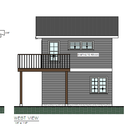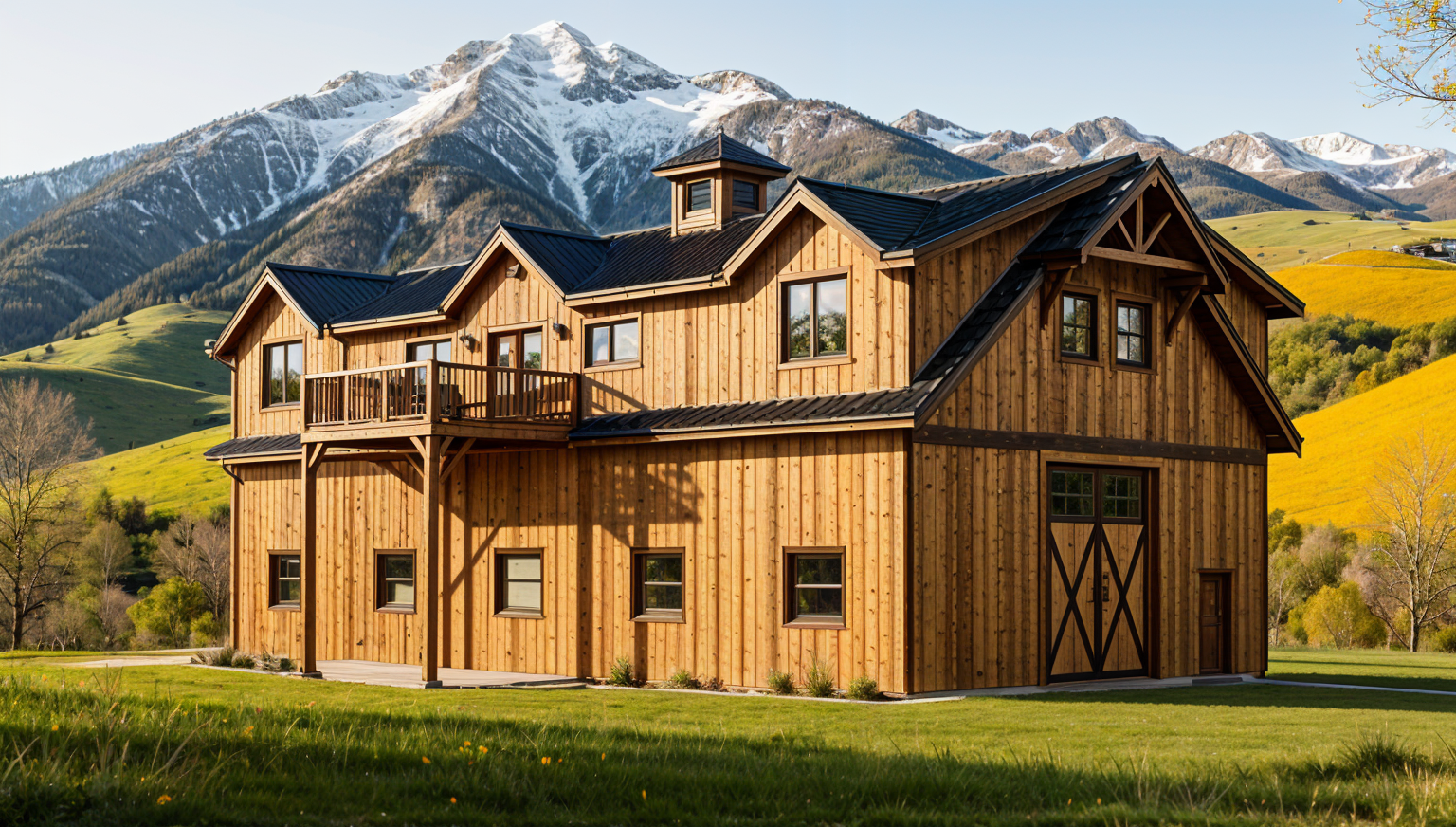 render a picturesque two story house with a charming rustic design the exterior walls are clad in elegant gray horizontal siding accentuated by a classic white trim around the windows and doors the roof features a dark charcoal color seamlessly complementing the overall color scheme the balcony boasts a rich wooden hue contrasting beautifully against the gray siding with a sturdy black railing the foundation is adorned with a textured light gray finish set this house in a serene sunny environment with lush greenery surrounding the scene casting soft shadows and creating a warm inviting atmosphere