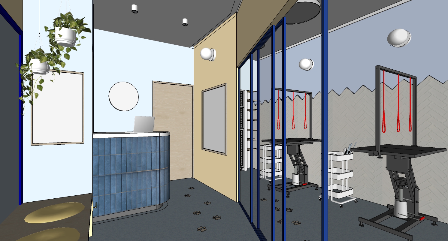 hyper realistic interior render of a modern dog grooming and bathing center inside a shopping mall eye level perspective view of the reception and grooming area neutral artificial lighting throughout the space 4000k no natural light the floor is gray satin vinyl smooth and slightly reflective in the foreground a curved reception desk clad in glossy blue ceramic tiles with realistic reflections and grout lines the space features royal blue metal and glass partitions separating the grooming area on the walls install spherical wall sconces globe wall lamps with neutral white light evenly spaced creating soft ambient illumination the ceiling integrates hidden led strip lighting one led strip washes the yellow accent wall with a soft even glow another led strip in the ceiling washes the blue back wall enhancing depth and texture the lighting should create subtle gradients on the walls realistic shadows and soft indirect illumination hanging plants near the reception area add warmth and contrast grooming tables with professional equipment are visible behind the blue glass partitions clean premium contemporary aesthetic realistic materials global illumination soft shadows subtle reflections on glass and tile architectural photography style ultra high resolution 4k hyper realistic render