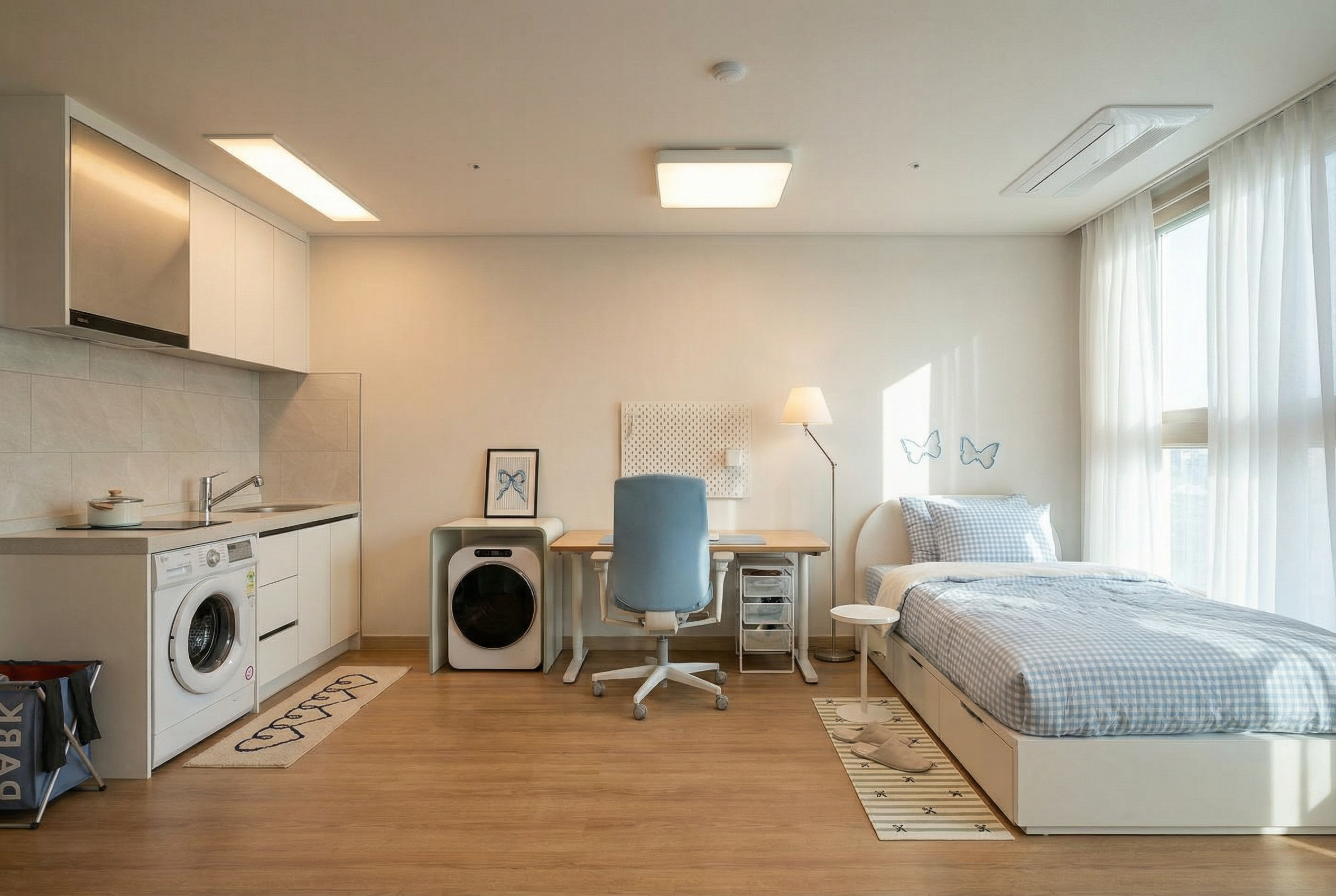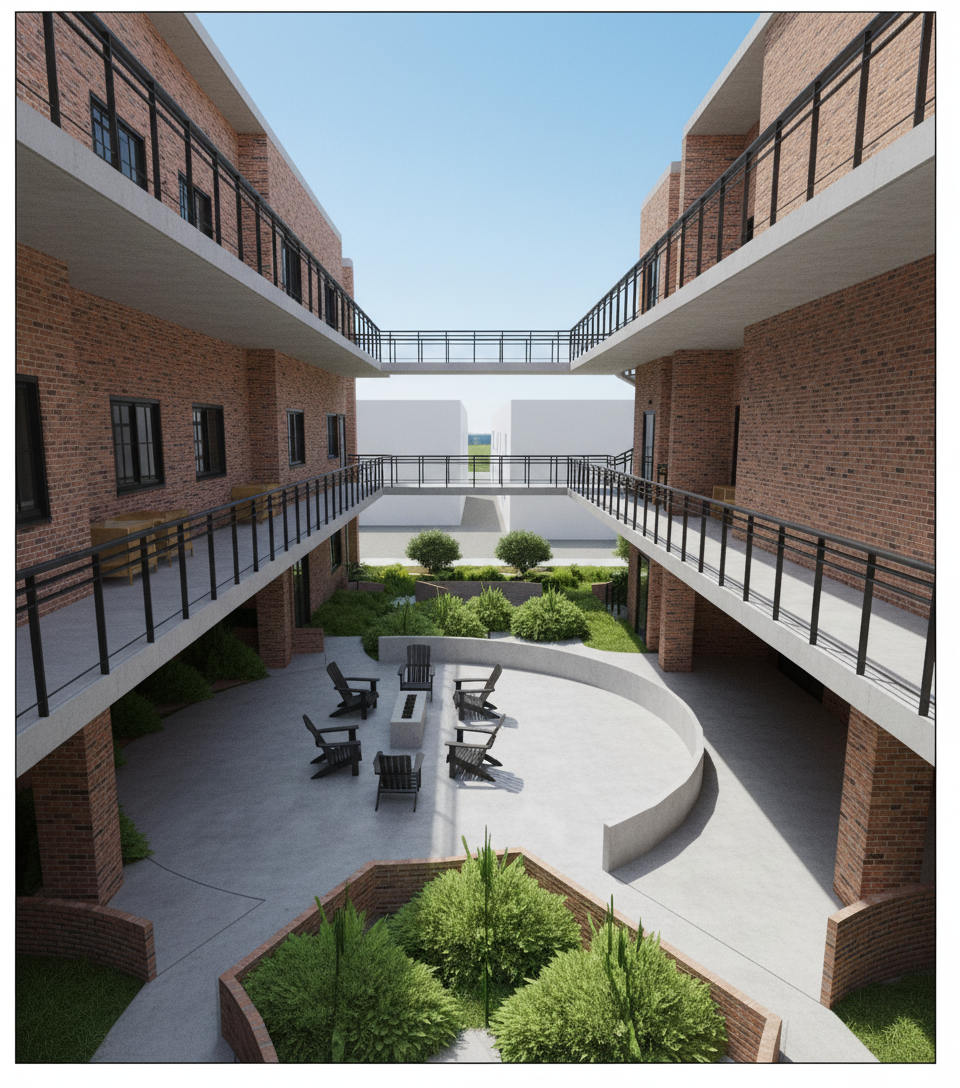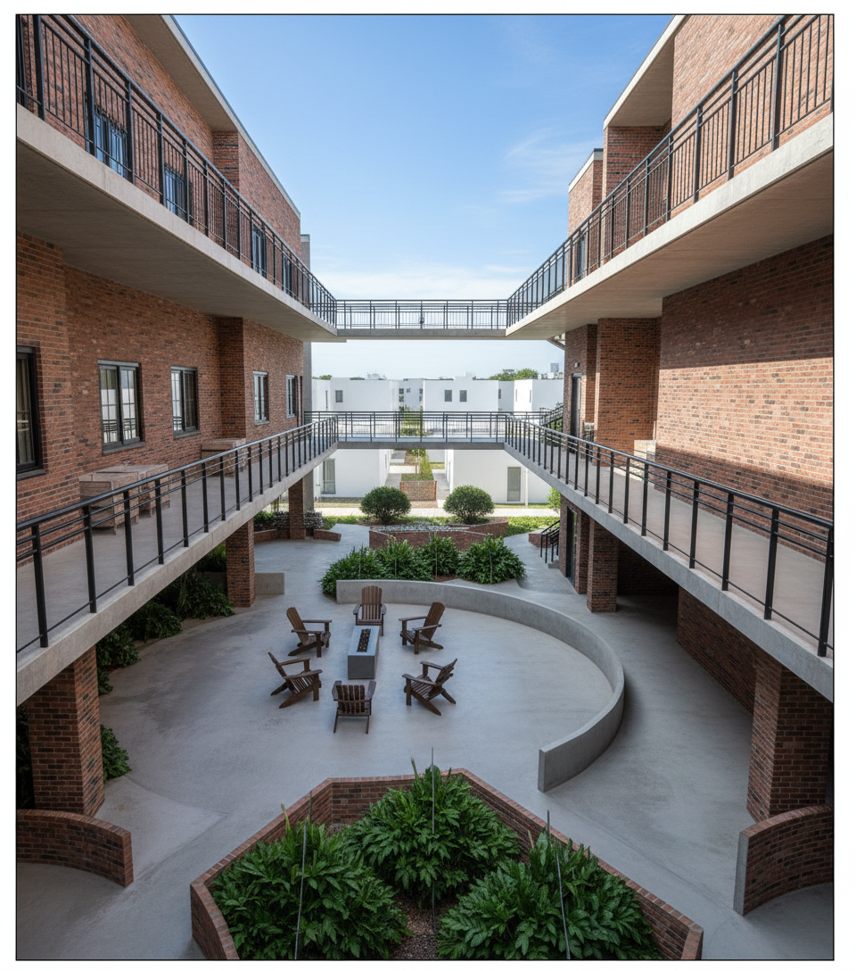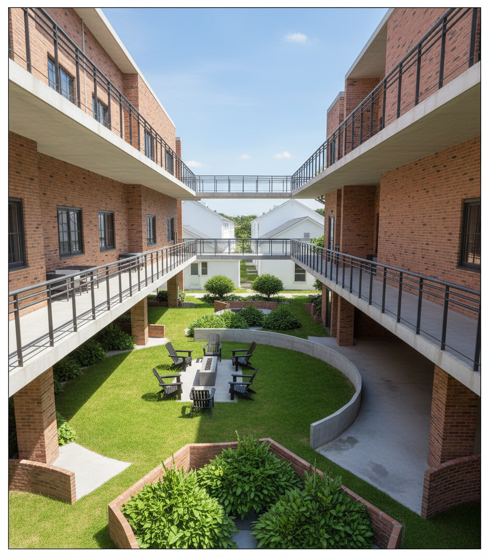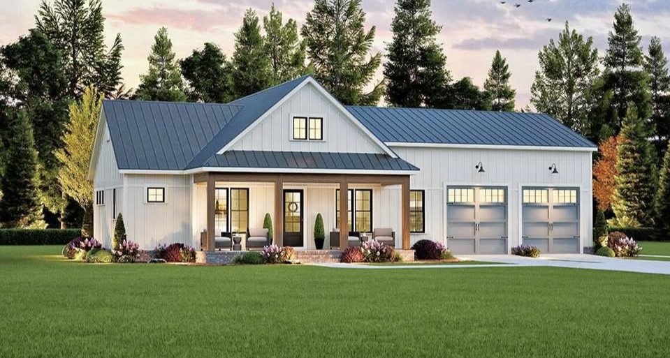 the building features a blend of modern architecture with natural stone accents and large windows reflecting the soft golden light of a summer sunrise the roof is a sleek black steel contrasting with warm wooden elements around the entrance the sky is a harmonious blend of pastel orange and light blue enhancing the tranquil and picturesque summer atmosphere