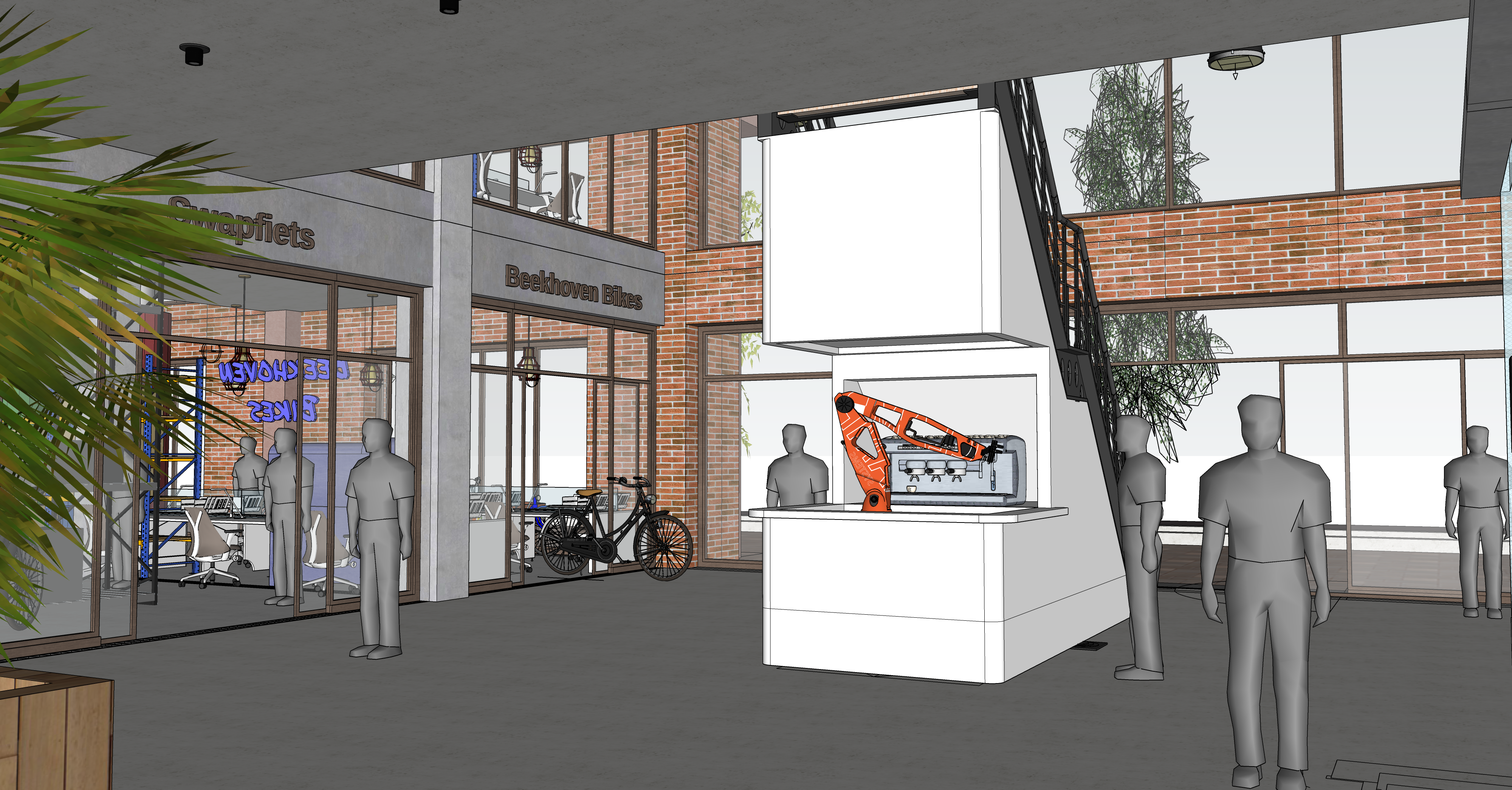 modernist interior shot industrial coworking space wooden details robot arm serving coffee architecture