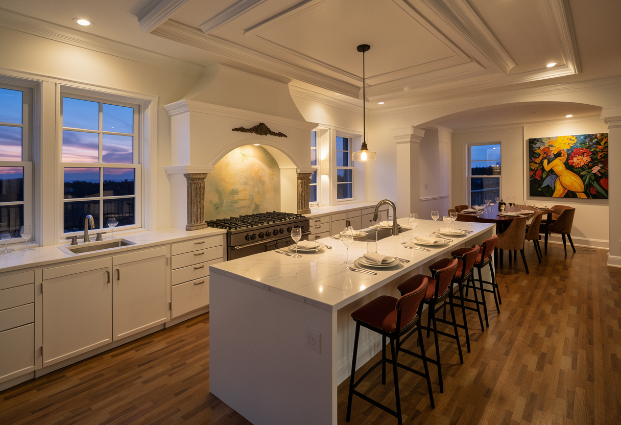 elegant realistic image white painted panel walls add interior lighting soft dusk sky outside add place settings add colorful painting on back wall remove place settings on sink side add ceiling coffer centered on island change nothing but light fixture over the island to more ornate soften lighting